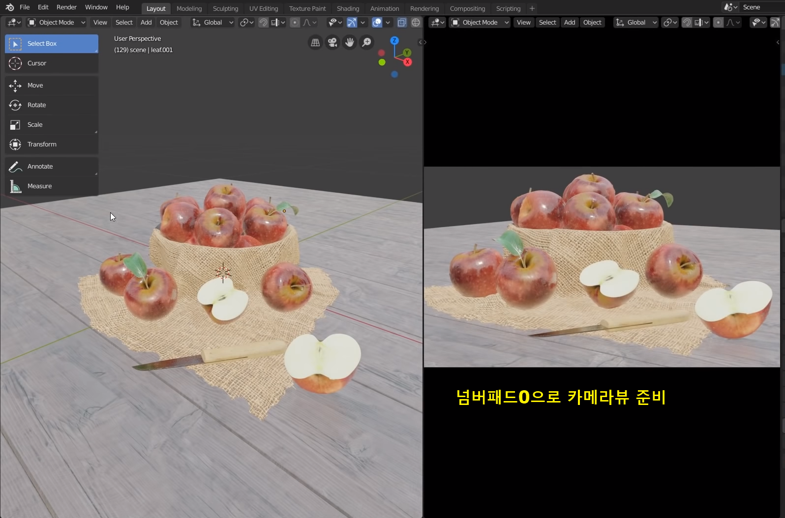 오른쪽은 넘버패드0을 눌러 카메라뷰로 세팅