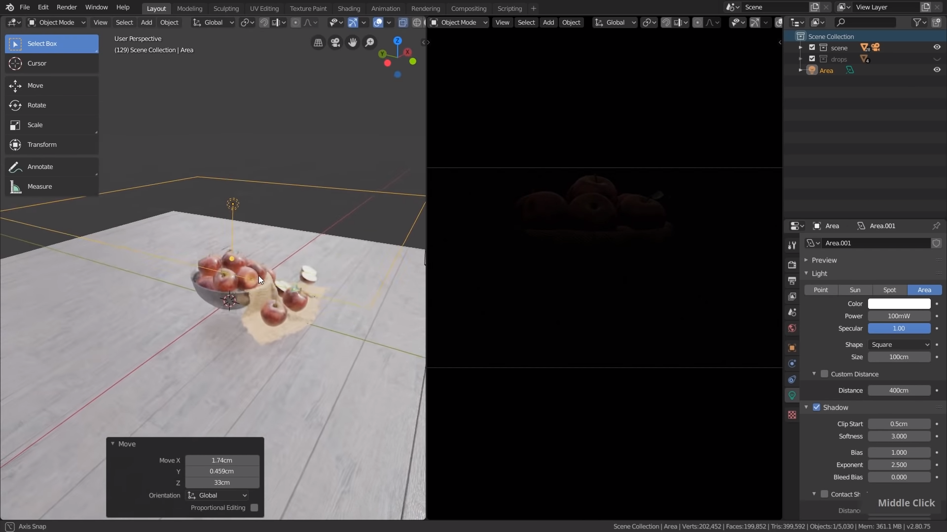 라이팅 세팅을 위해 두개로 나눠진 화면 준비