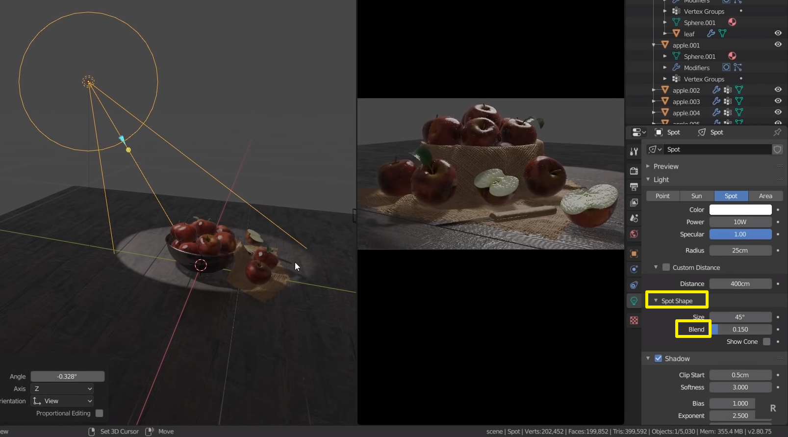 Blend로는 조명의 테두리 선명도 조절 (스포트라이트처럼 내다꽂히는지 아닌지..)