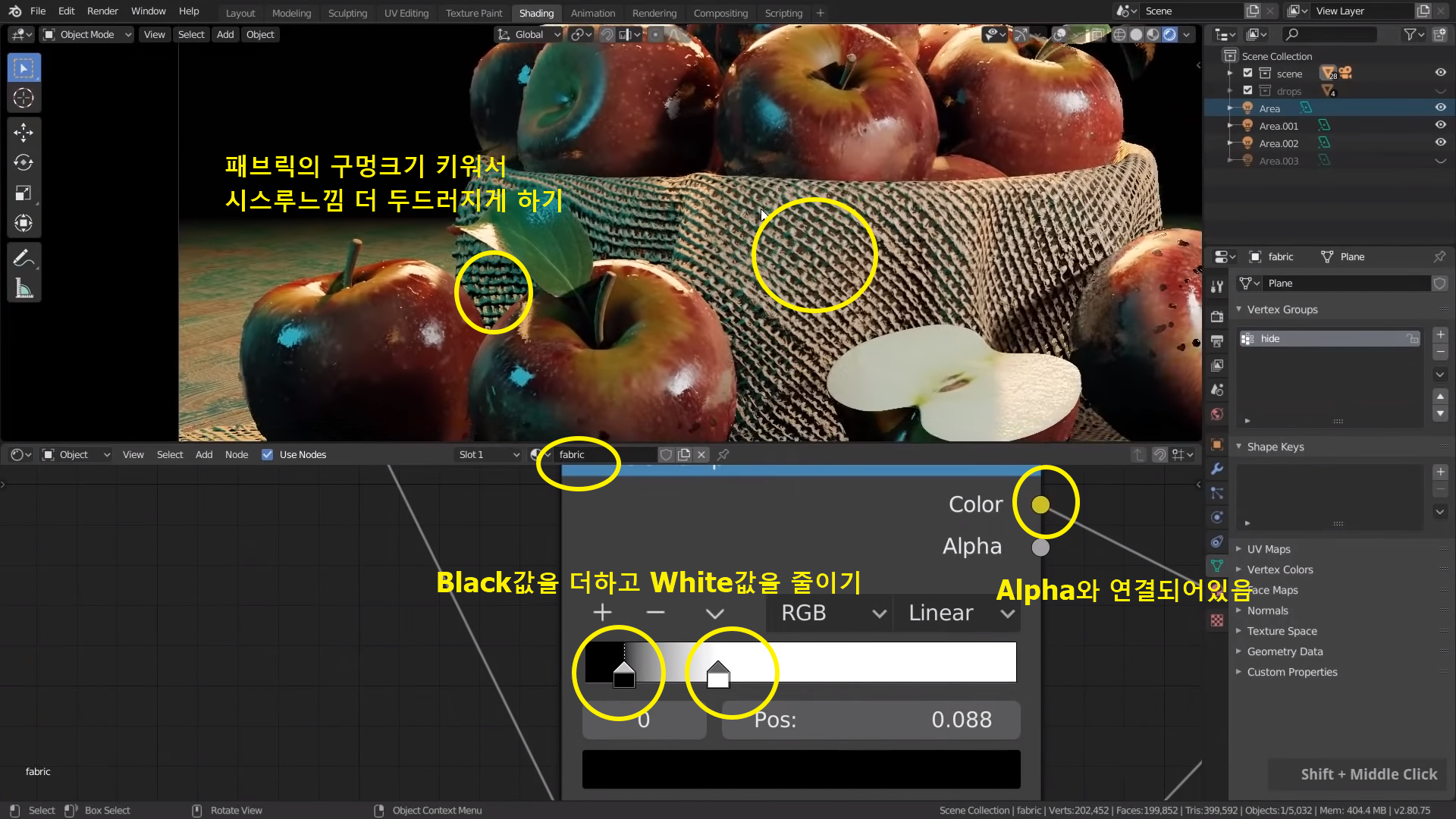 Principal BSDF 에서 Alpha 값과 연결된 ColorRamp에서