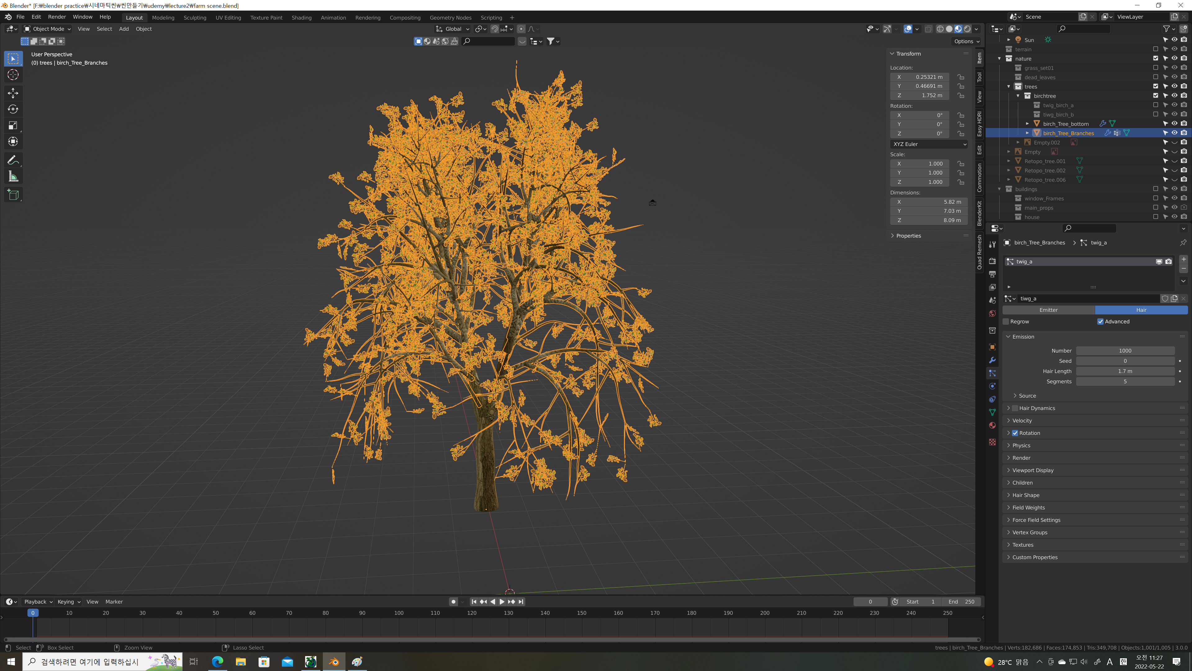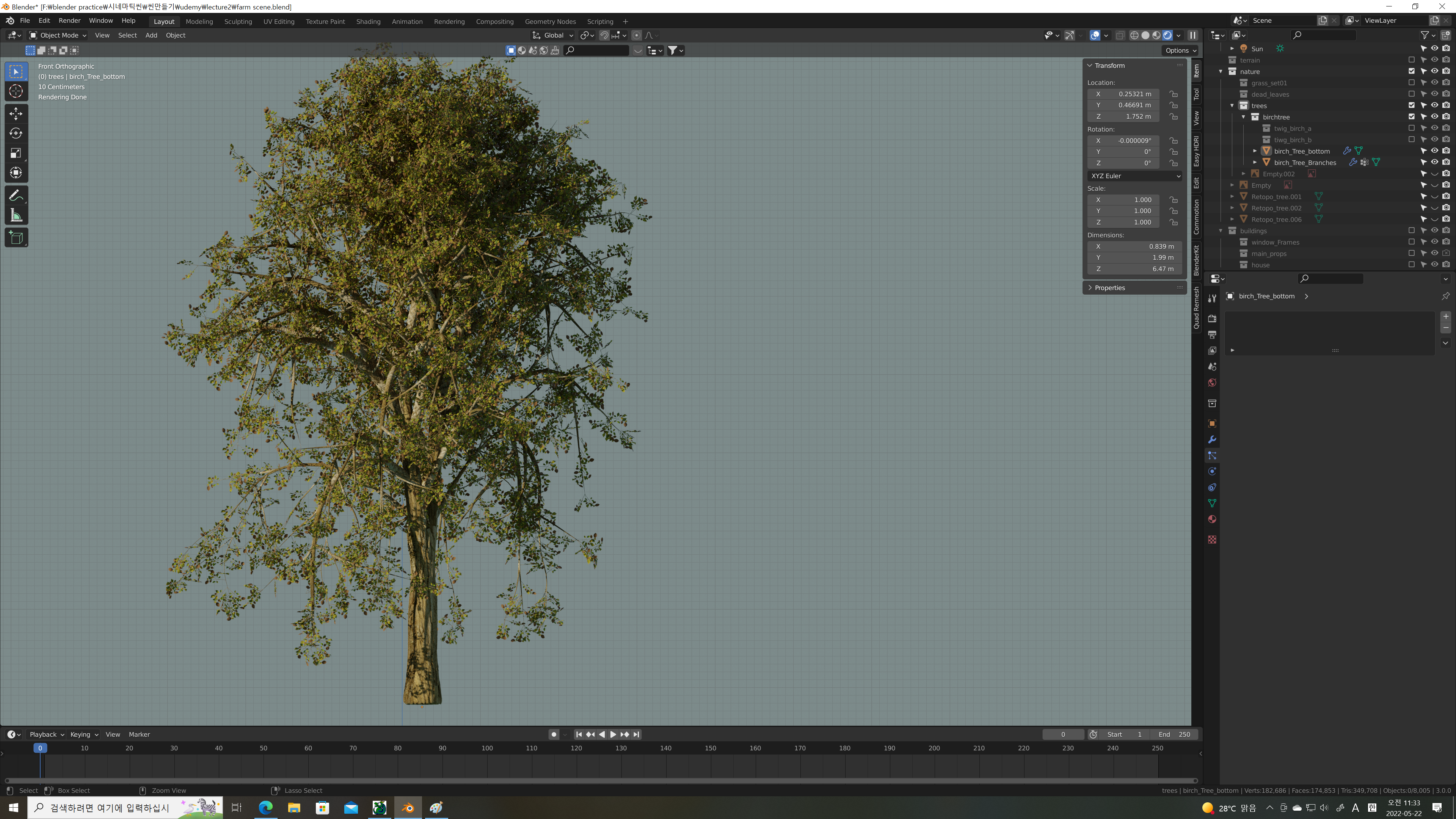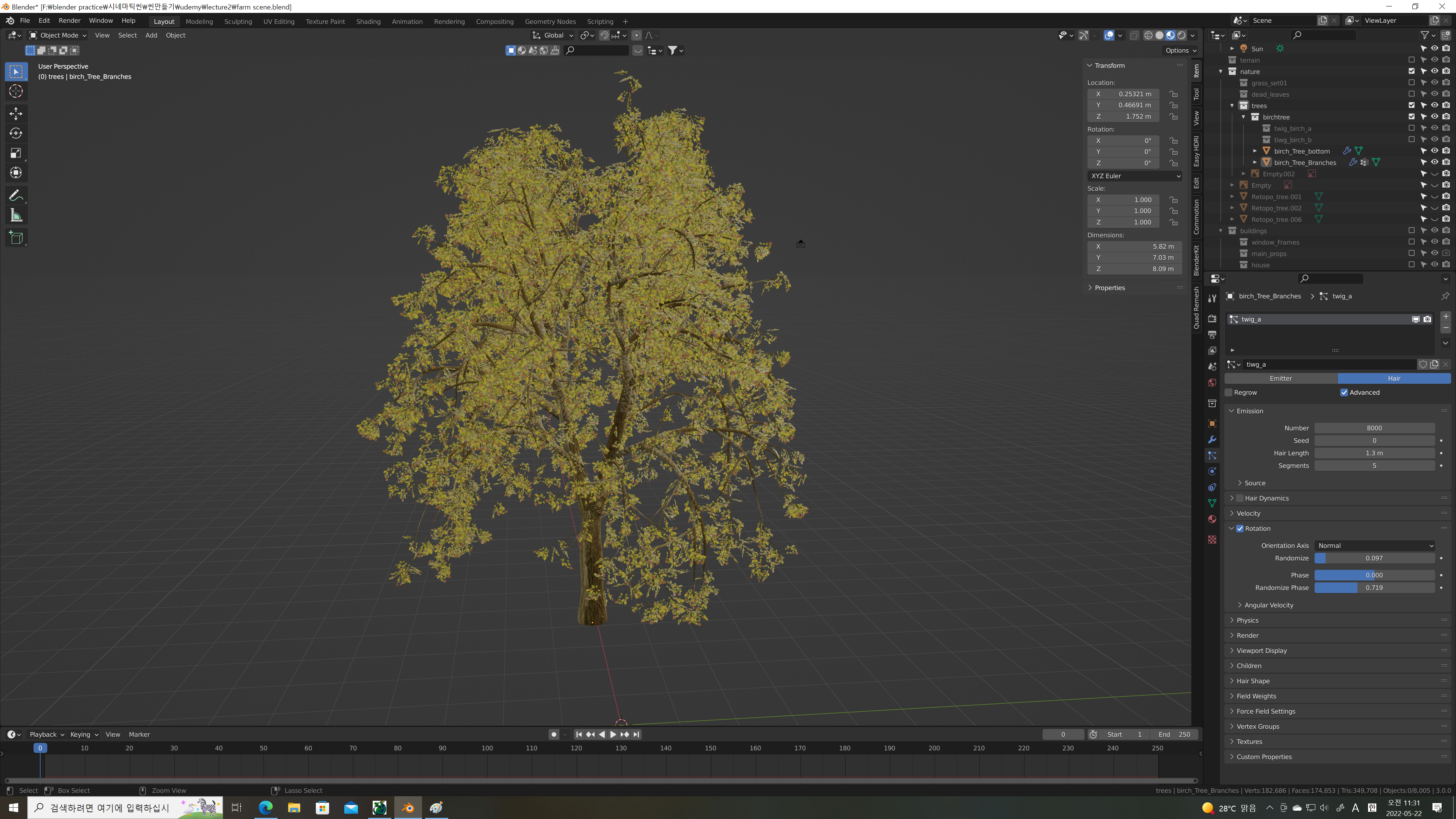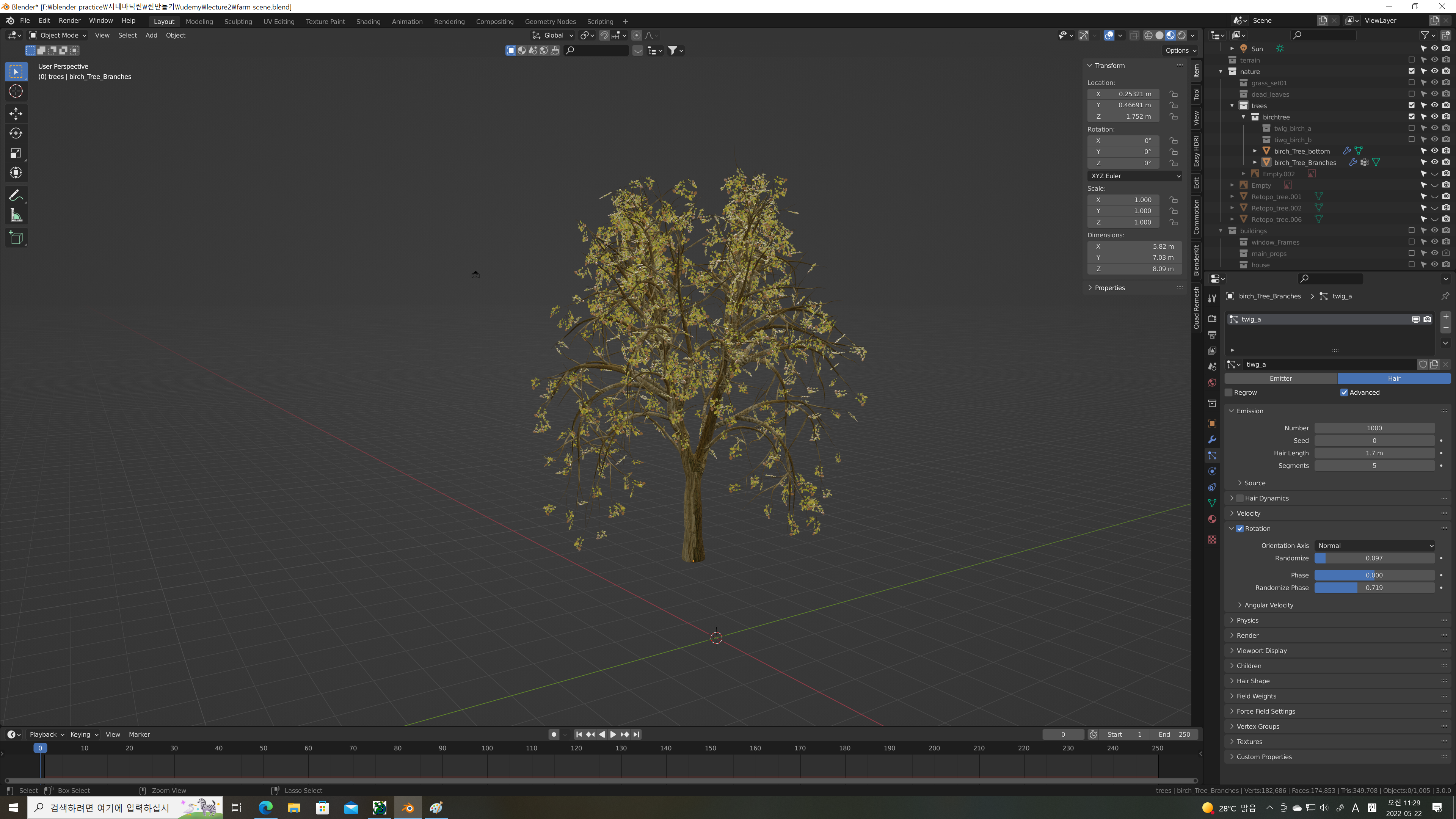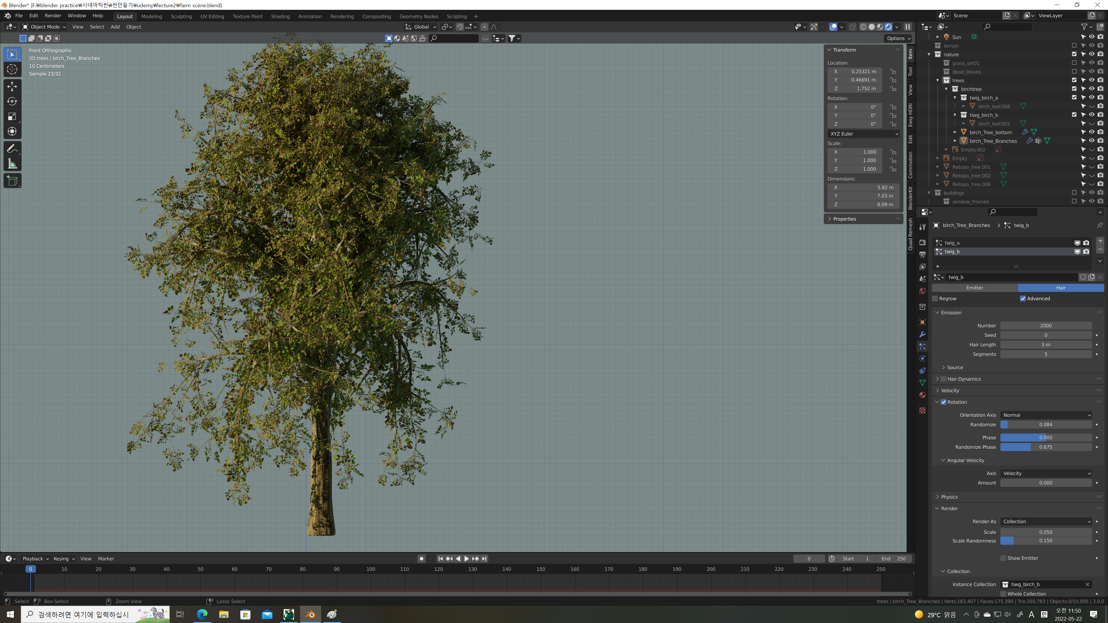 이렇게 기본 베이스는 블렌더에서 제공하는 sapling 애드온을 사용한 다음,