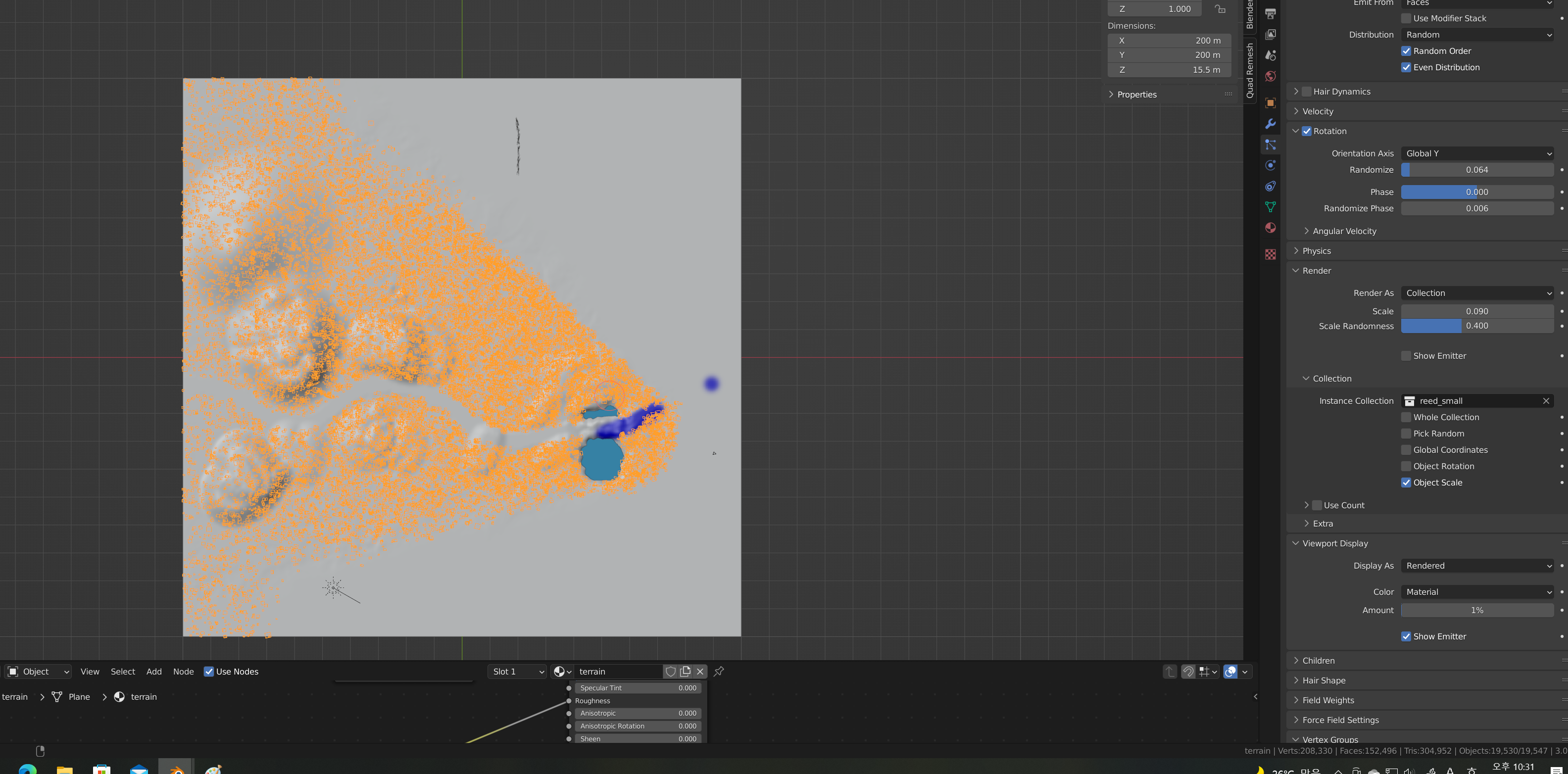 파티클 시스템에서 grass 파티클만 켜놓고 viewport display는 1%로 줄여줌