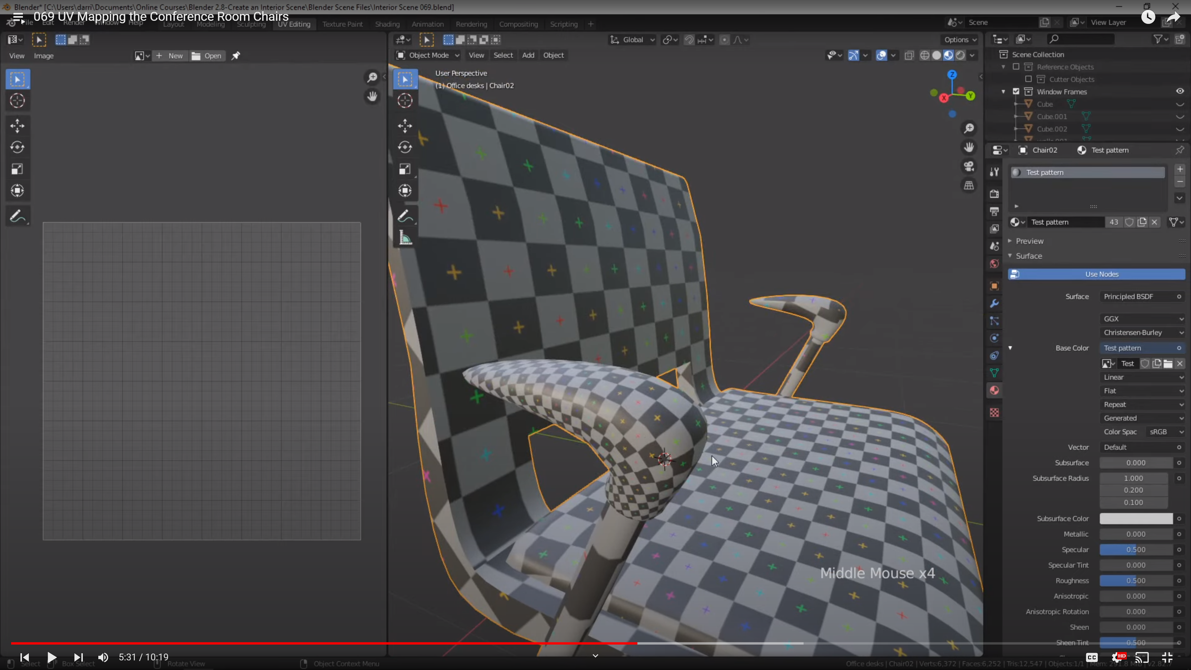 mateiral view에서 uv grid(체크보드) 적용된것을 볼 수 있음