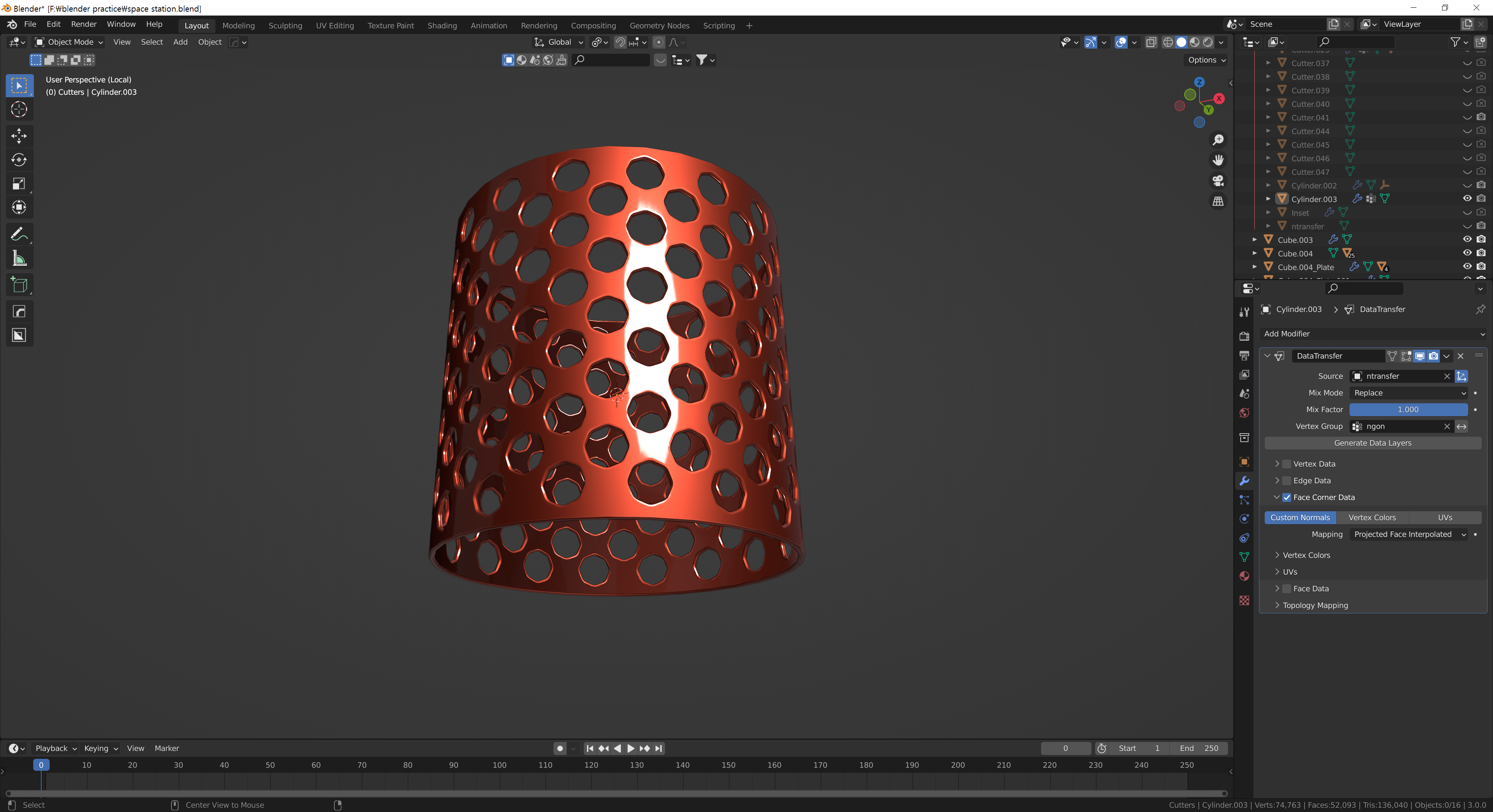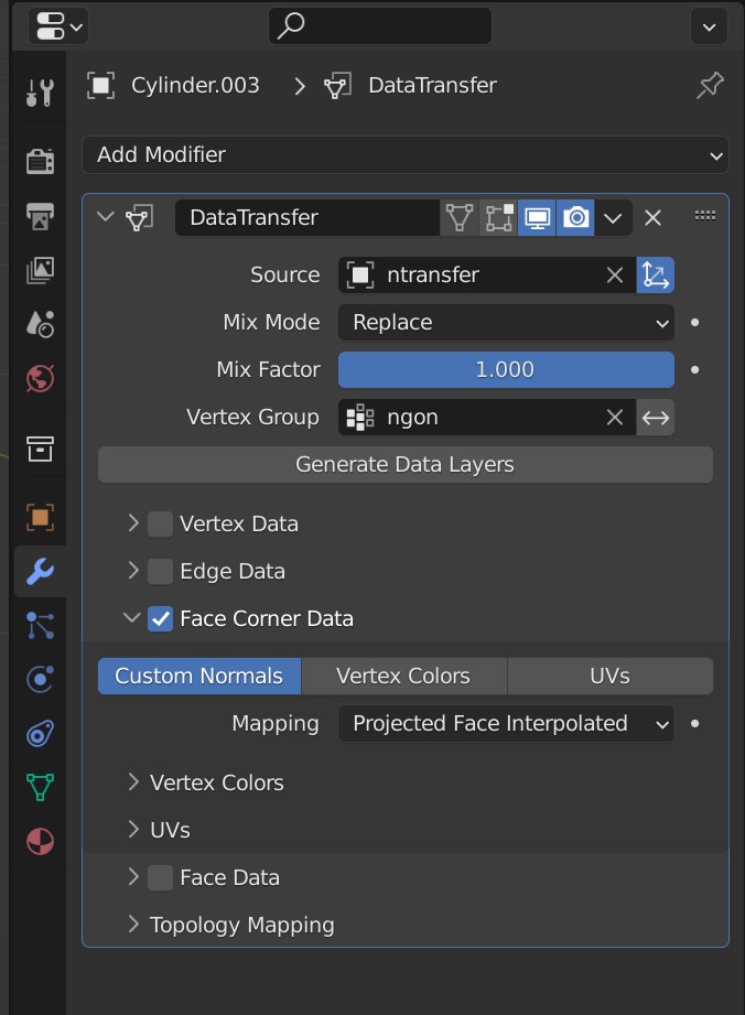 이 구멍 뚫린 메시에다 Data Transfer 모디파이어를 추가해줌