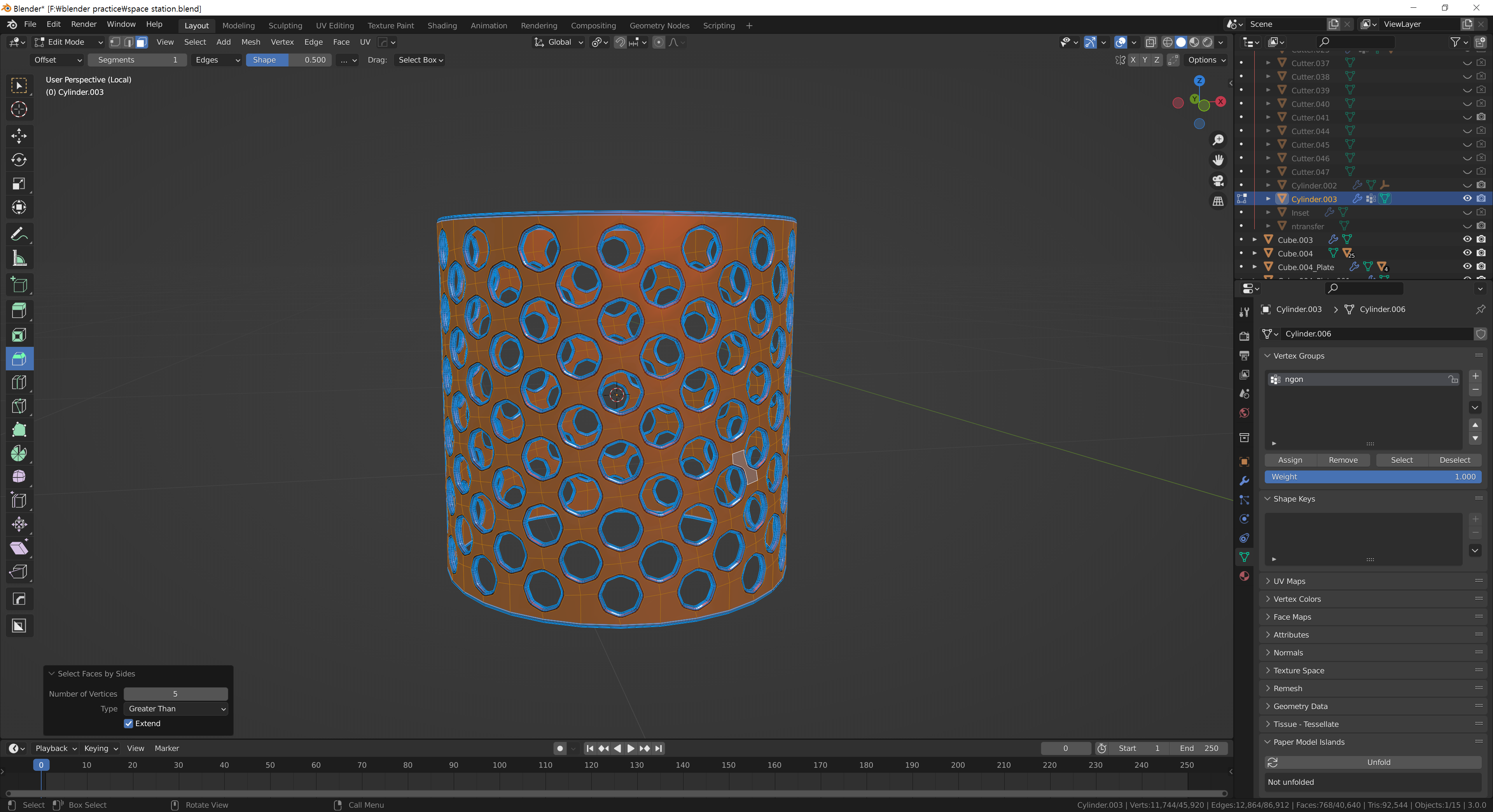 이렇게 선택된 페이스들을 vertex group에서 새 그룹(이름:ngon)으로 지정해주고