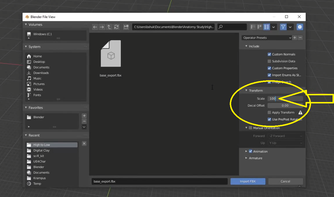 임포트시 스케일을 100으로 해주자