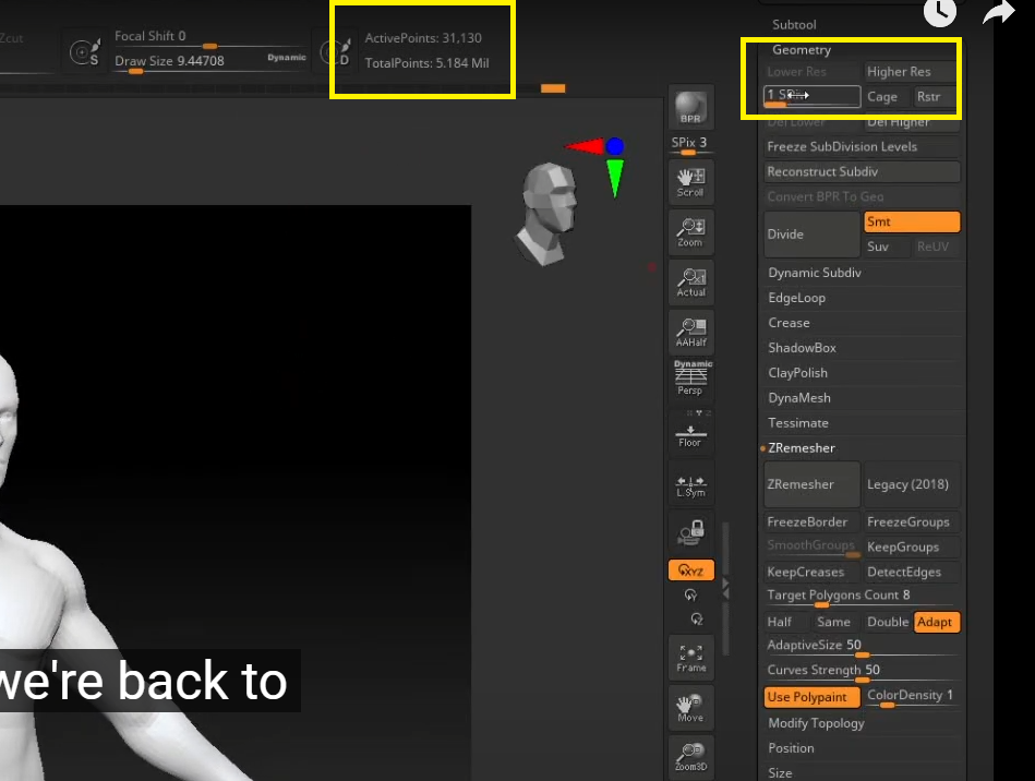 얼굴 컬러는 빨간색으로 지정. 빨간색으로 칠해진부분을 ZREmesher가 자동으로 하이폴리로 만들어줌