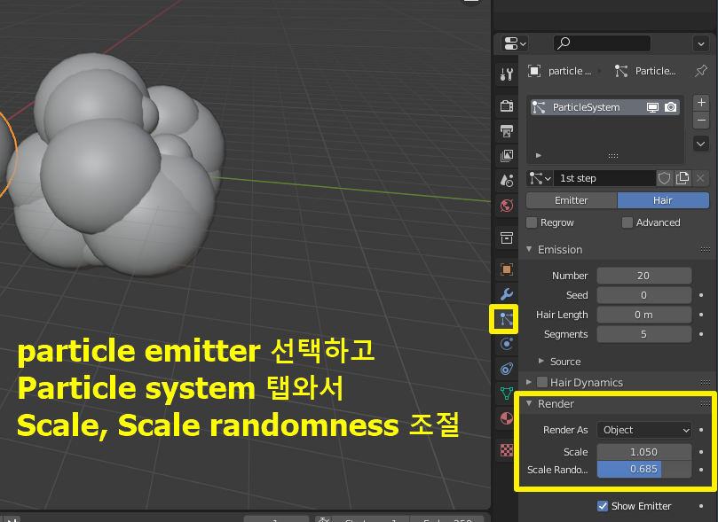 Particle Emitter에서 Render Scale과 Scale randomness변경