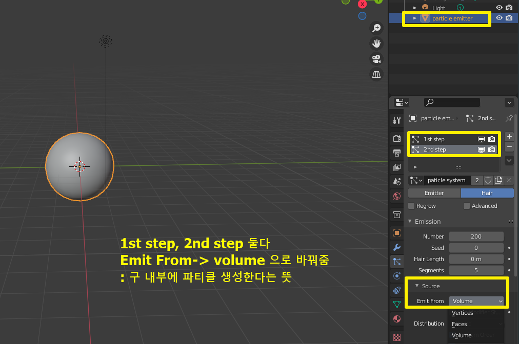 Particle system은 1st step 선택