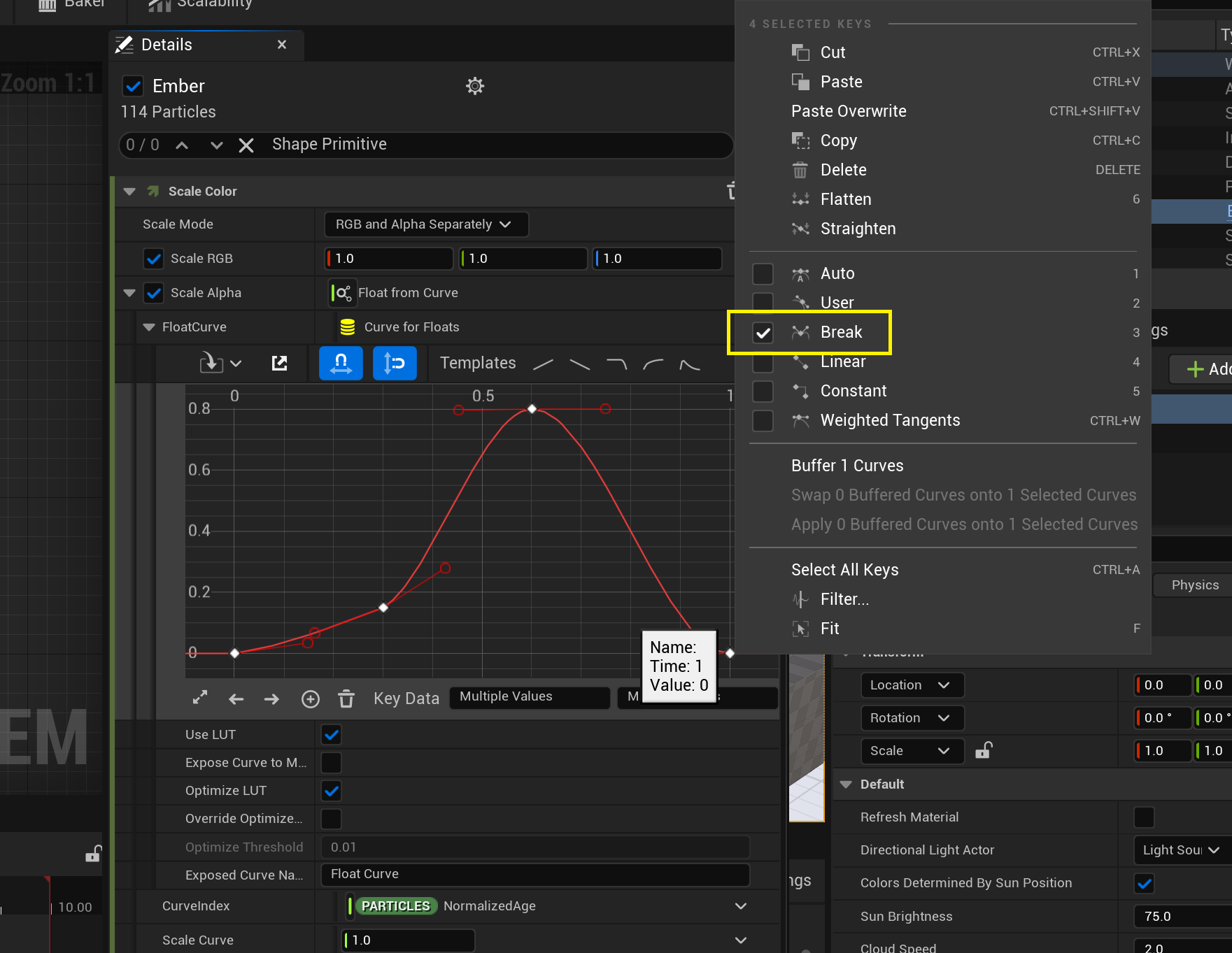 그럼이렇게 그래프를 조절해서 알파 투명도가 시간에 따라 바뀌게 할수있음 그래프에 키 추가하려면 마우스 중간휠버튼을 누르면됨