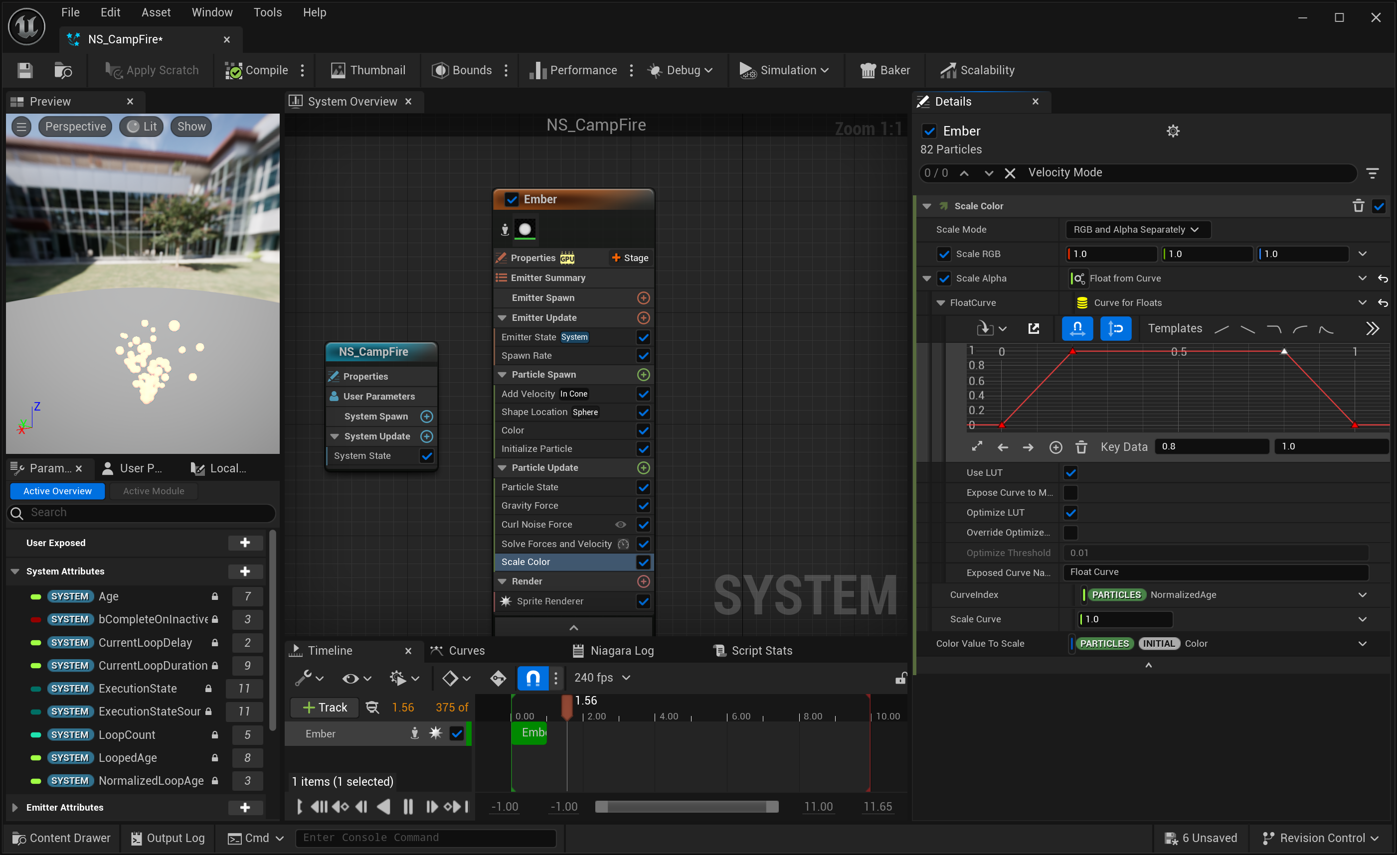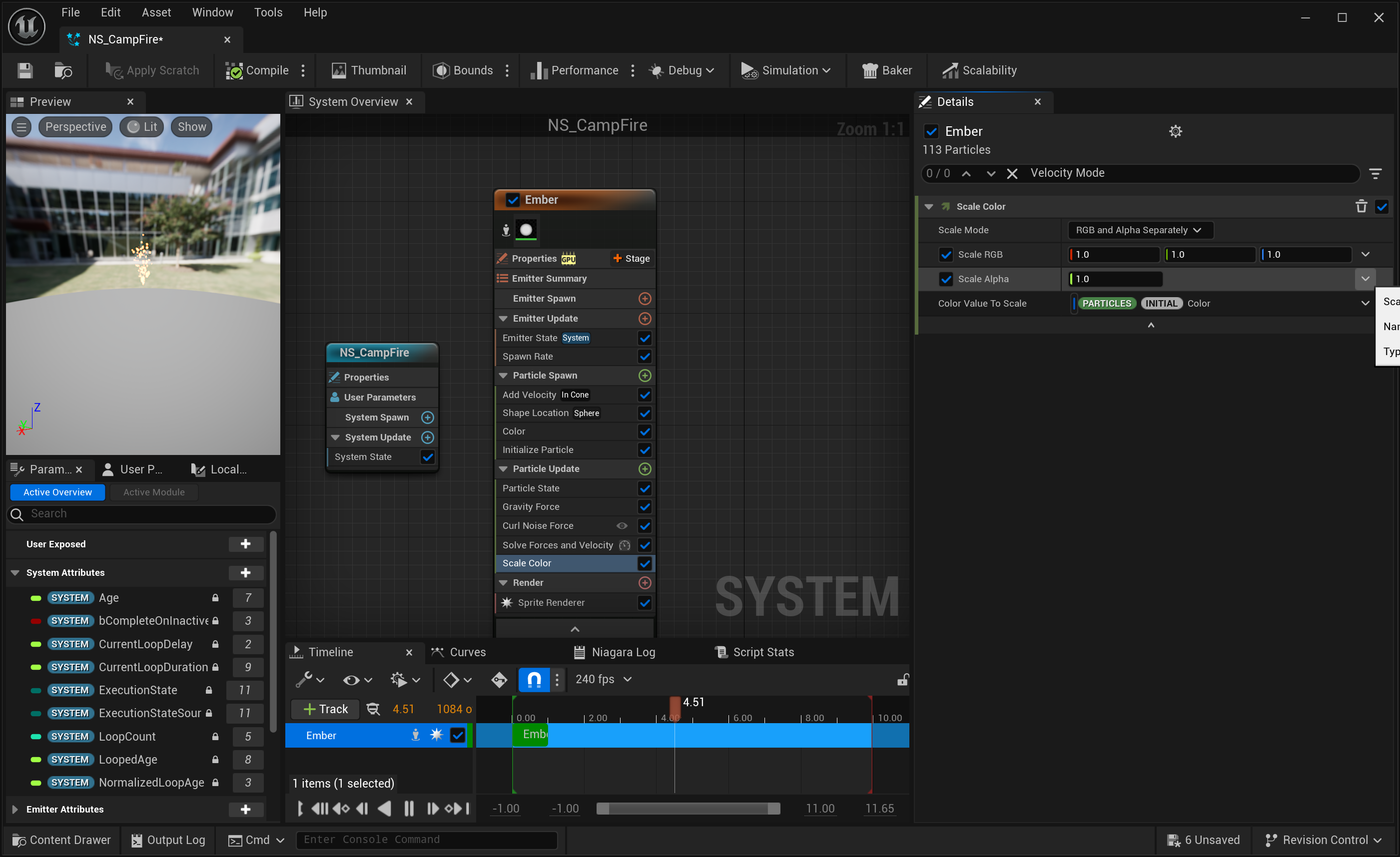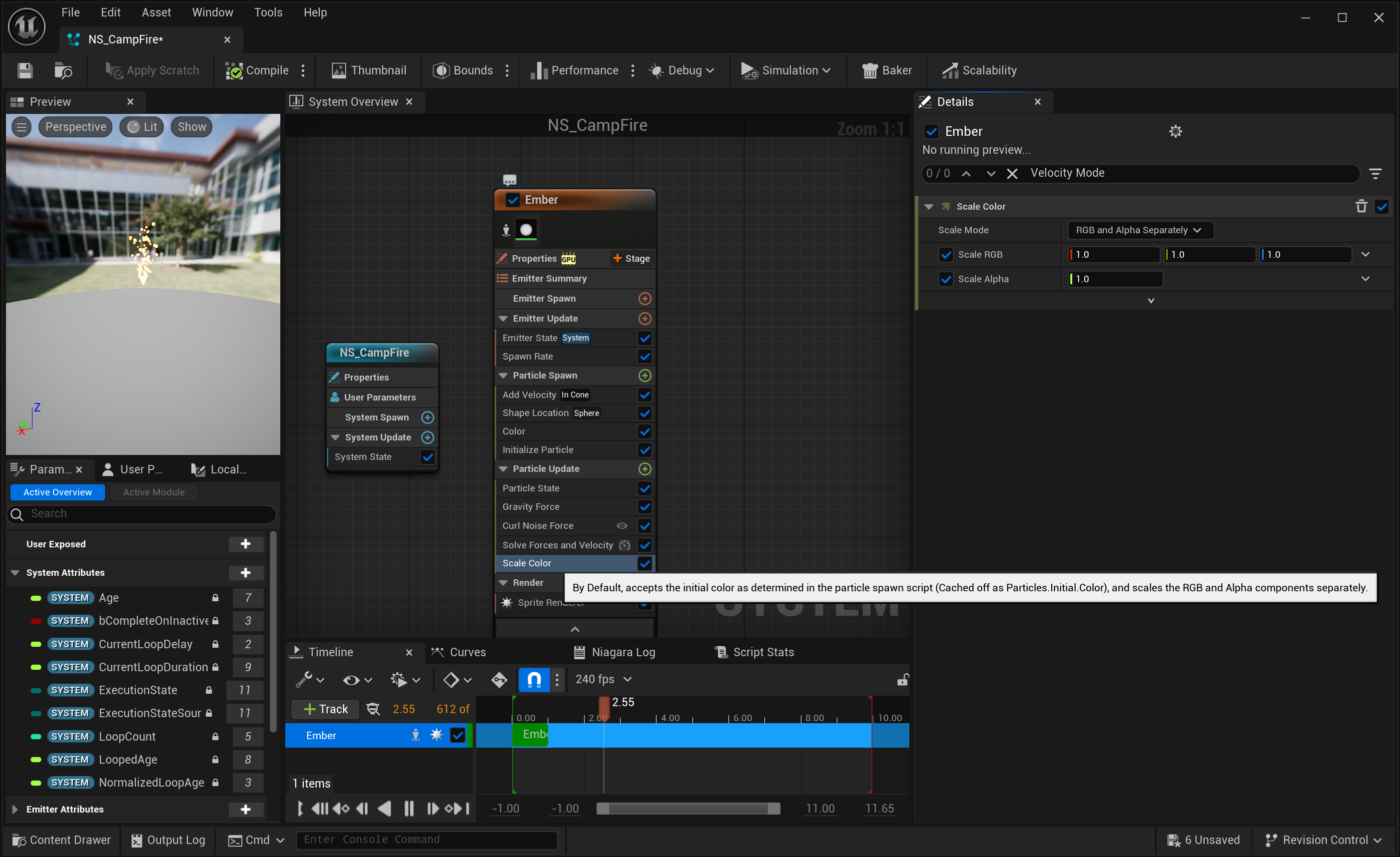 Particle Update 아래에 scale Color 추가해주자. 파티클이 자연스럽게 사라지게할 투명도더할것임 처음에는 알파값을 내려서 반투명하게하다가