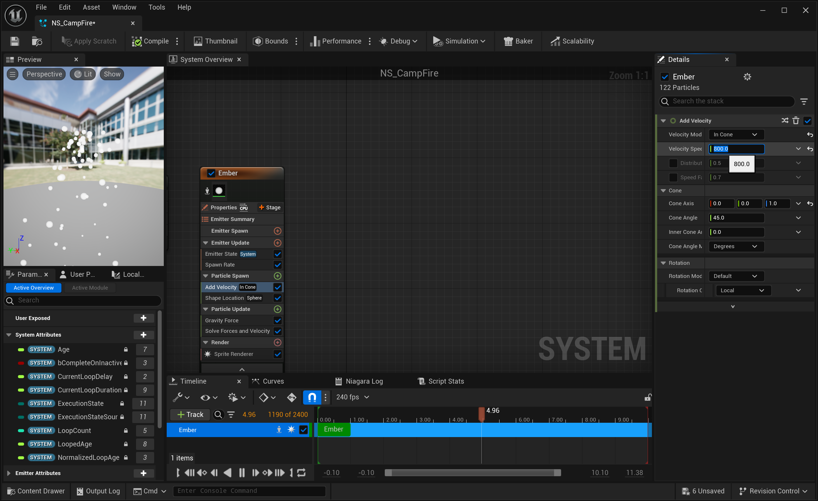 velocity Speed (구버전에선 velocity strength였음) 를 800으로 올려주자 약간 분수느낌으로 치솟아 올라갔다 떨어짐 떨어지는걸 더 빠르게 바꾸고싶다면 gravity z 값을 -980(디폴트)에서 -1800으로 더낮게