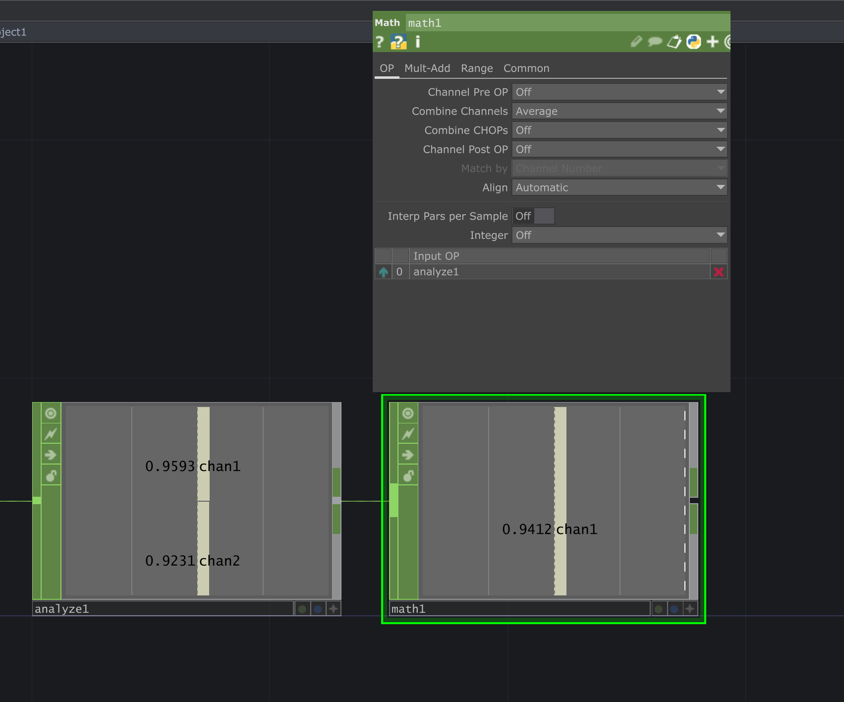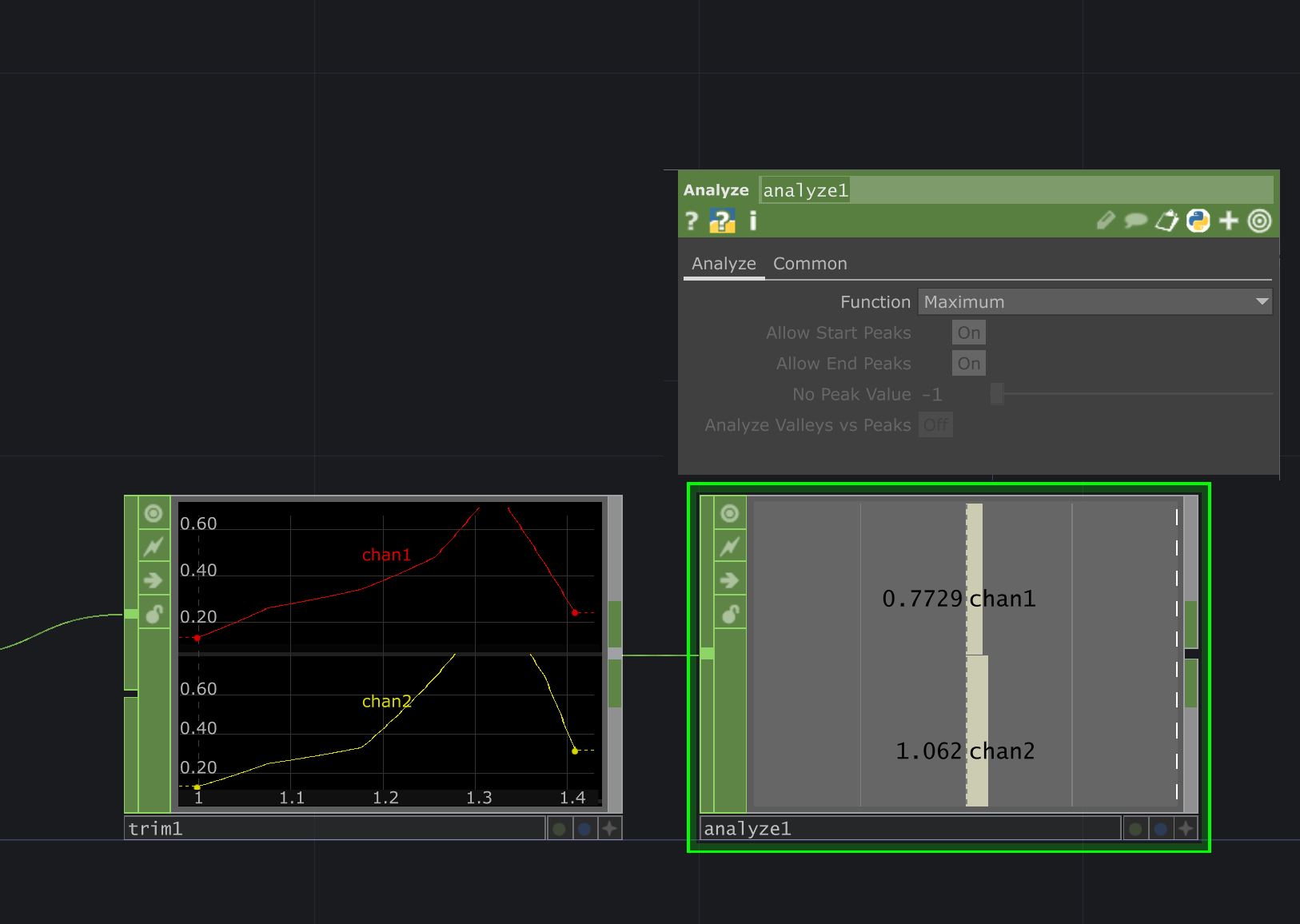 트림 뒤에다가 analyze 노드 붙이고 Maximum 모드로 바꿔줌 maximum 먹은신호를 가져다 average 기능 사용해서 하나의 신호로 합쳐줄것임!