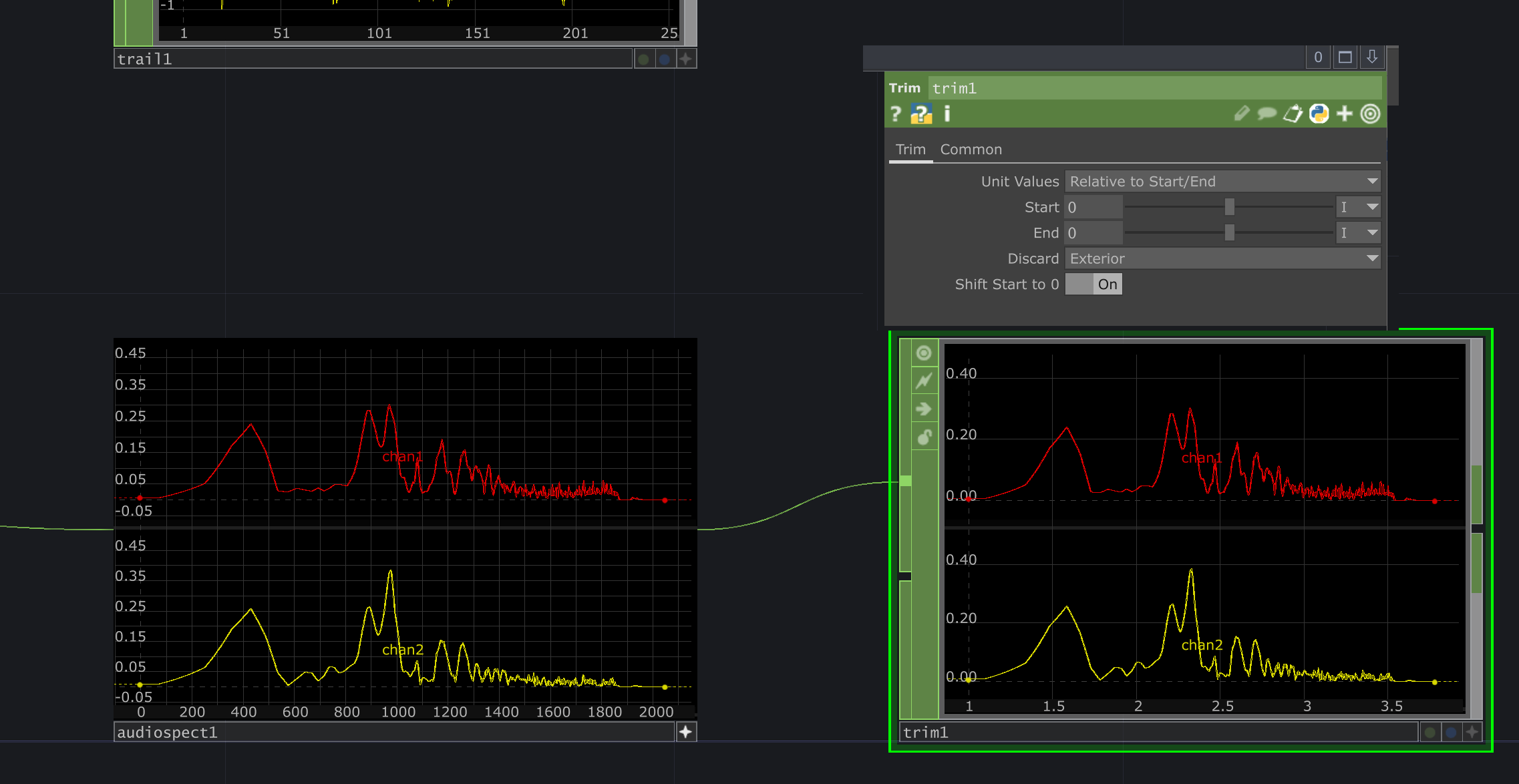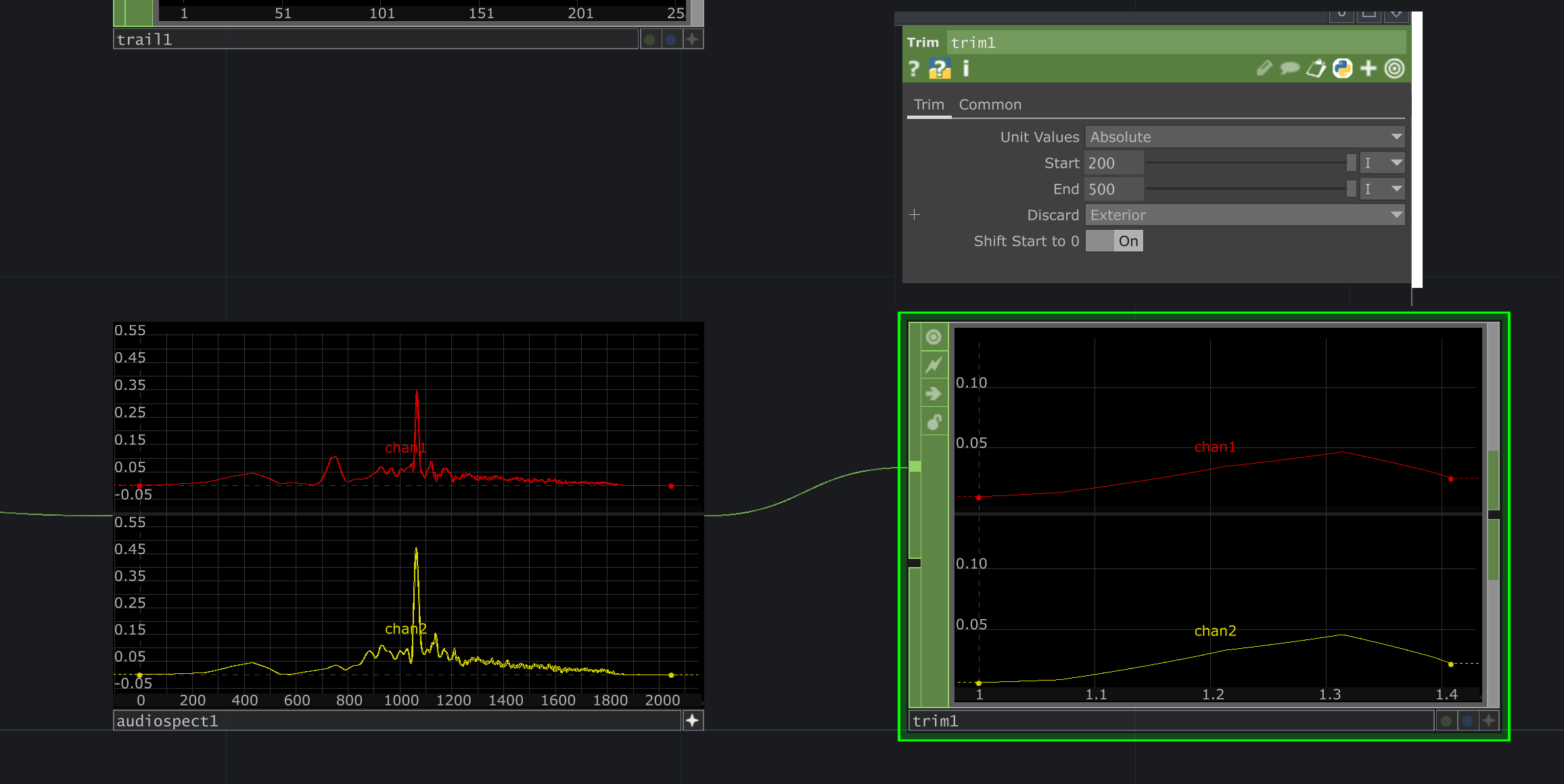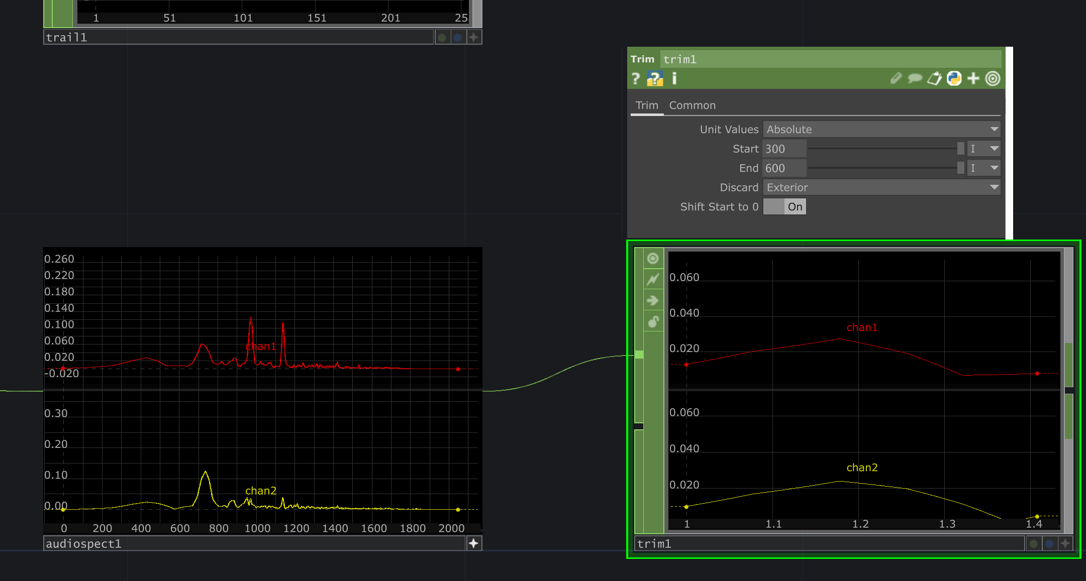 audio spectrum에서 똑같은 방식으로 노드를 추가해줌 분석전 트림 노드에서는 어느부분을 자를지.......1400~1600부분의 샘플을 자를것임