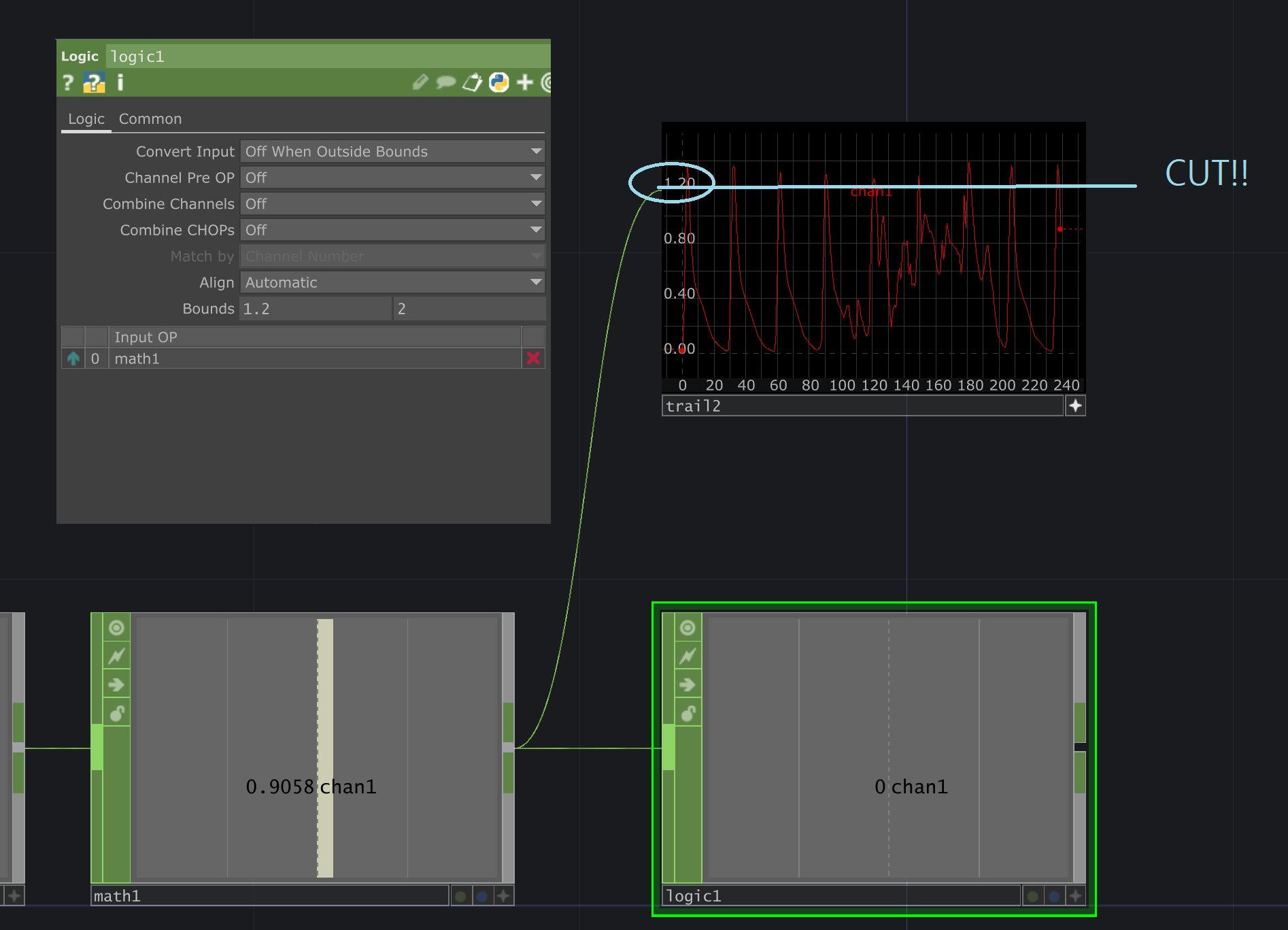 아주 굿.. trail노드에 넣어서 결과를 비교해본 모습 노란색이 로직 노드를 먹인 결과다
