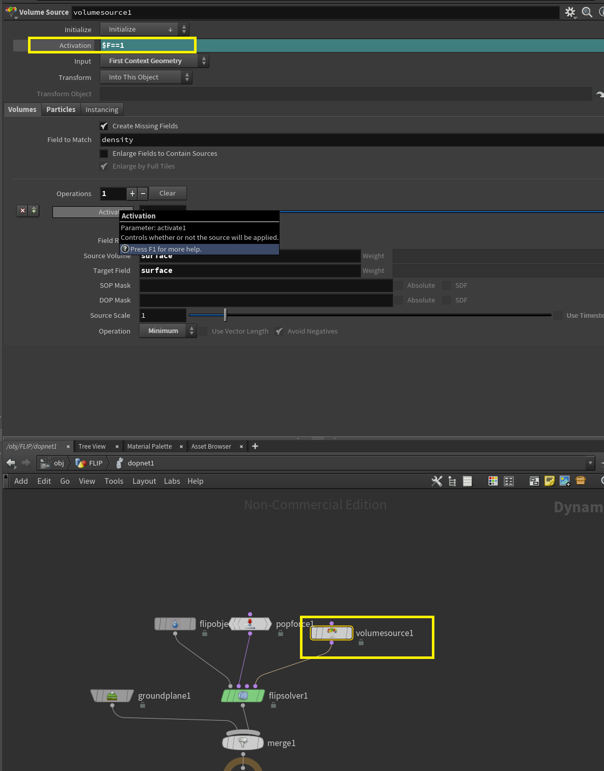 Flip>Dopnet>volumesource 노드에서 activation을 $F==1로 수정해주자 첫번째 프레임에서만
