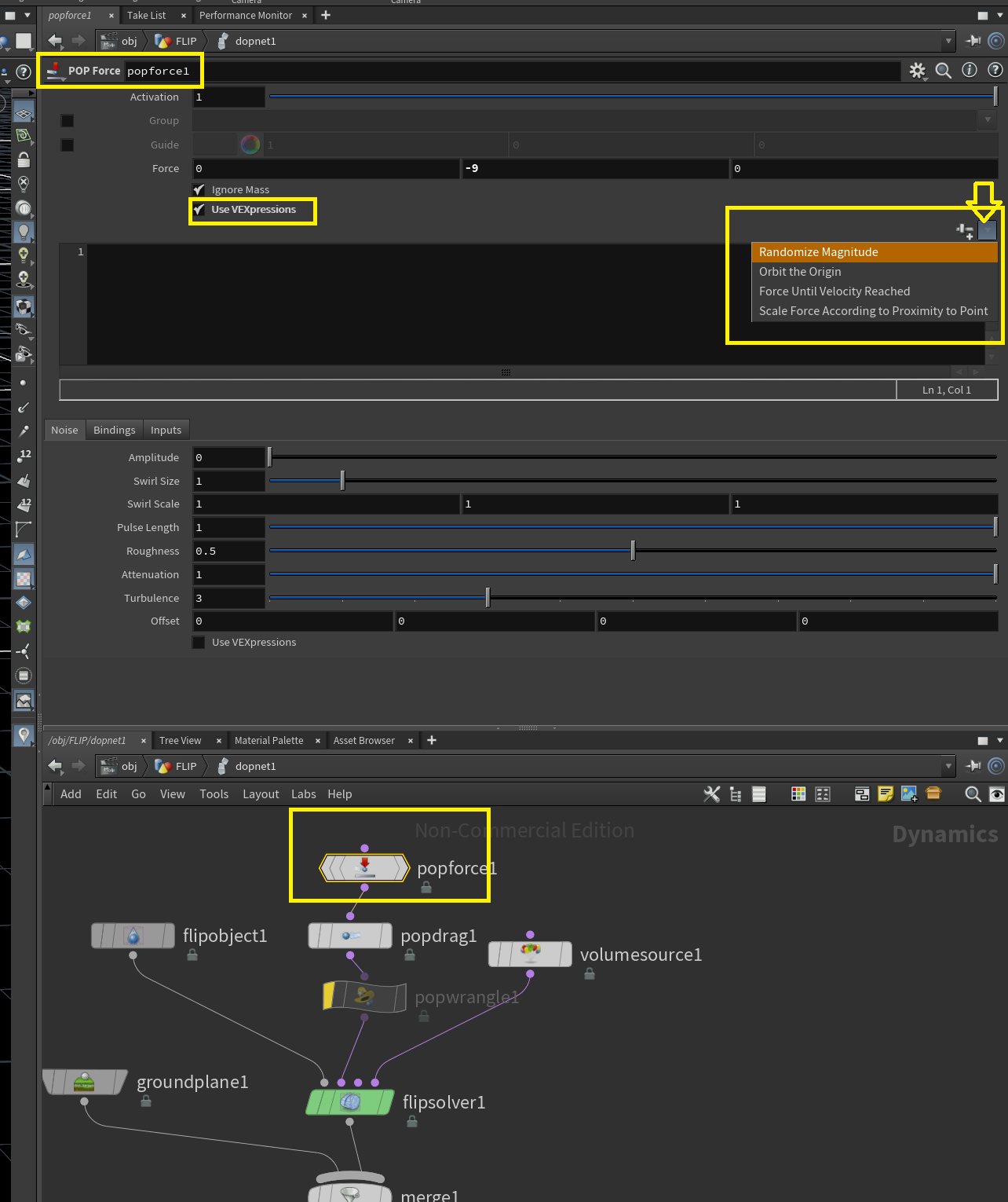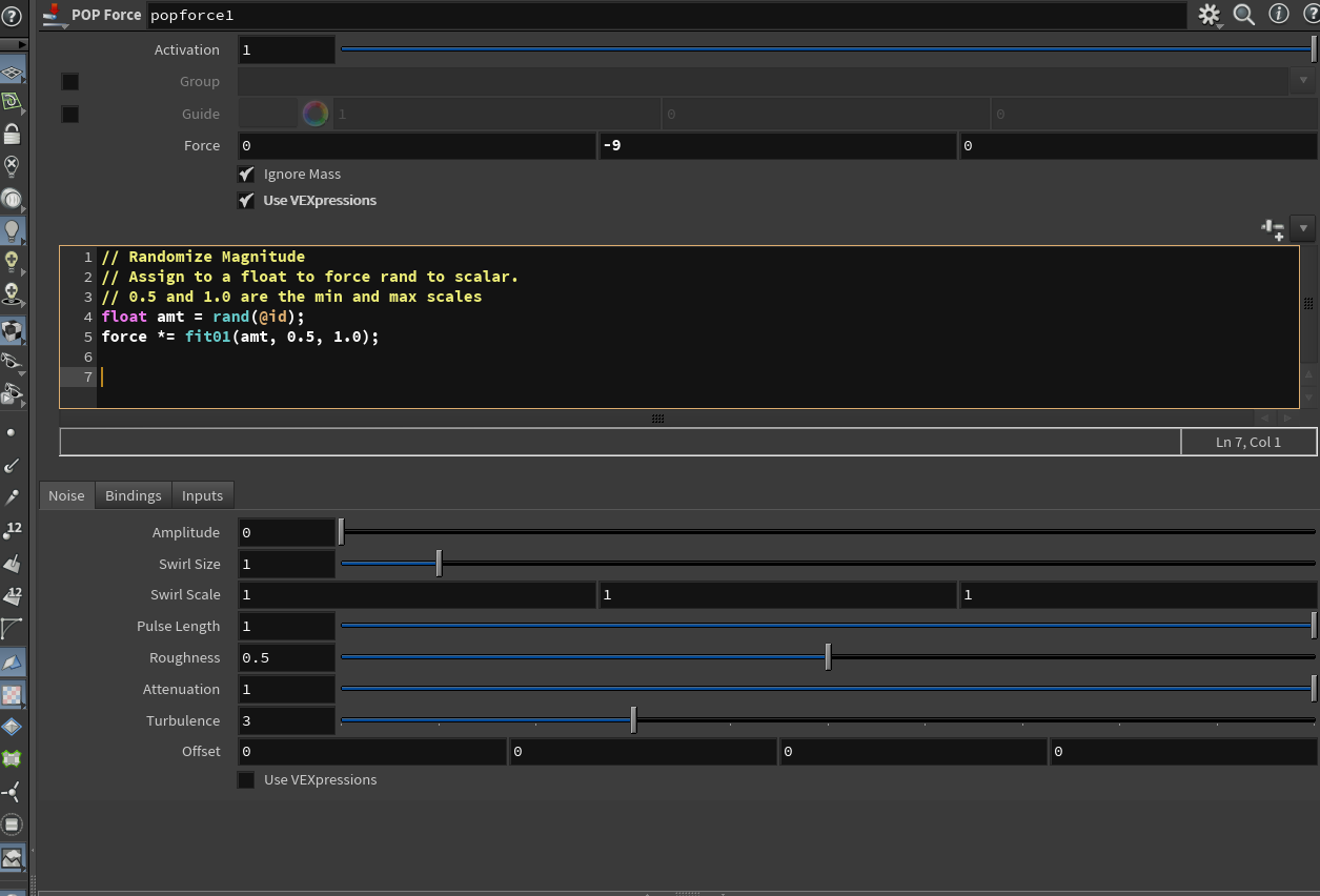 pop force에서 vexpression을 켜주고 Ranomize Magnitude로 선택해줌