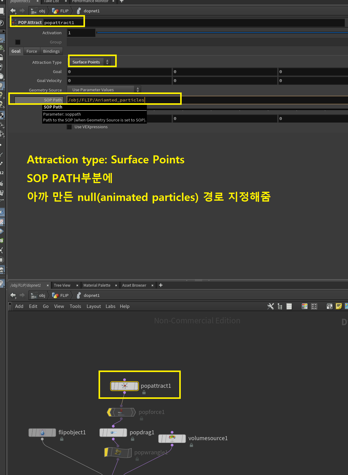 pop attract 노드를 맨위에 넣어주자. (pop force는 hide)