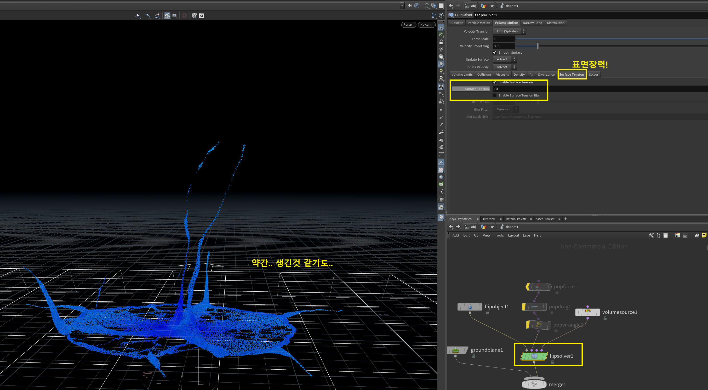 dopnet 안에 flipsolver> surfae tension 에서 표면장력 추가할수있음 10은 매우 높은편임