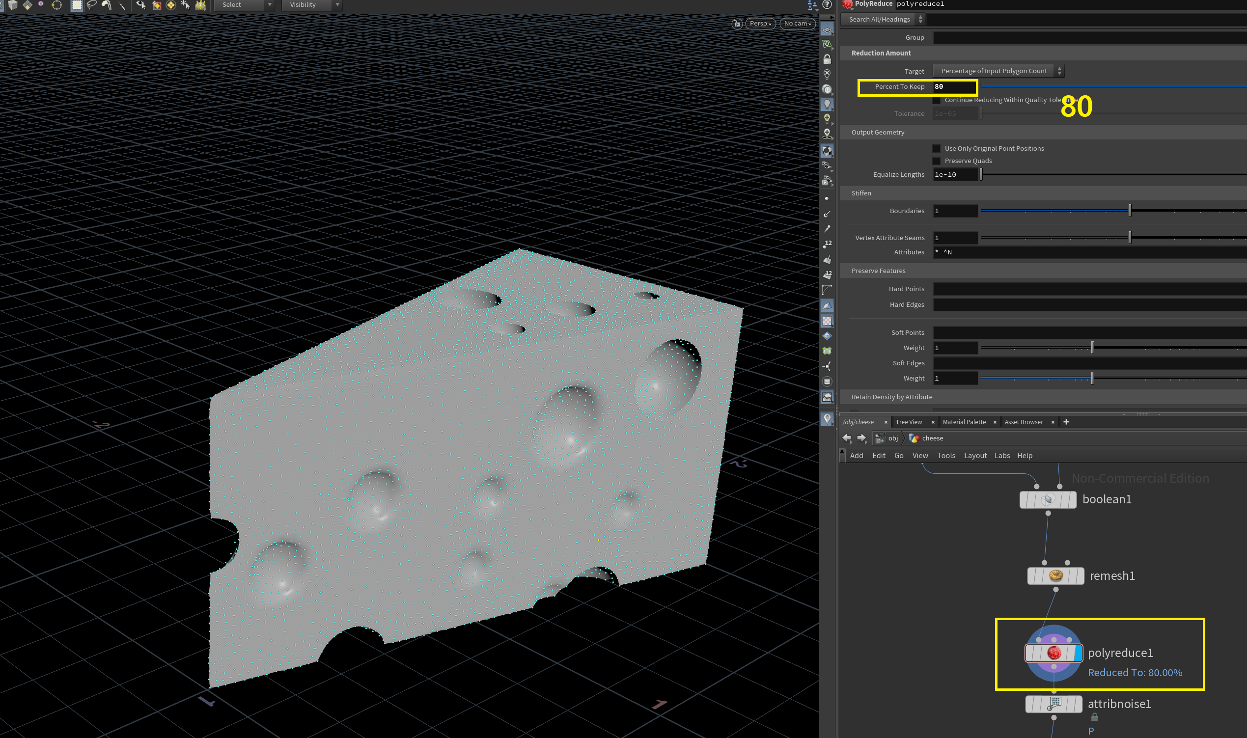 Attribute Randomize 노드에서 스피어의 최대크기 최소크기 조절! Boolean 노드 설명! remesh 노드 설명! 두번말하기 귀찮! remesh로 폴리곤을 너무 잘게 쪼갰다면 poly reduce로 약간의 최적화를.. 80%정도? poly reduce 노드는 블렌더랑 지브러쉬의 decimate가 생각나는..