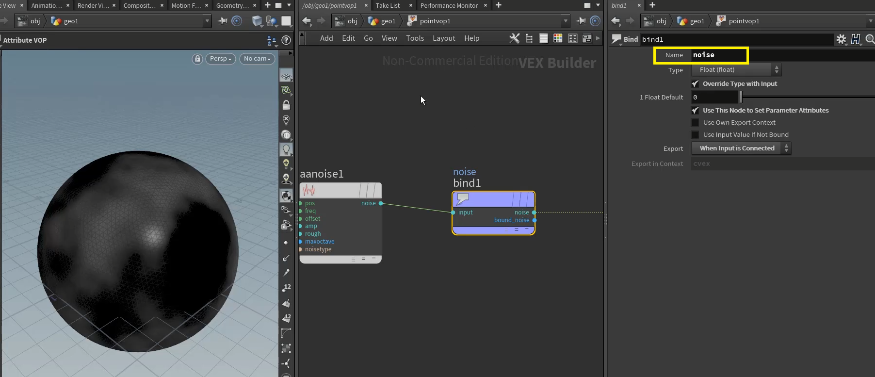 Bind export 노드의 디테일 패널에서 이름을 noise라고 붙여주자 이제 noise라는 이름의 속성이 만들어져 내보내진것!