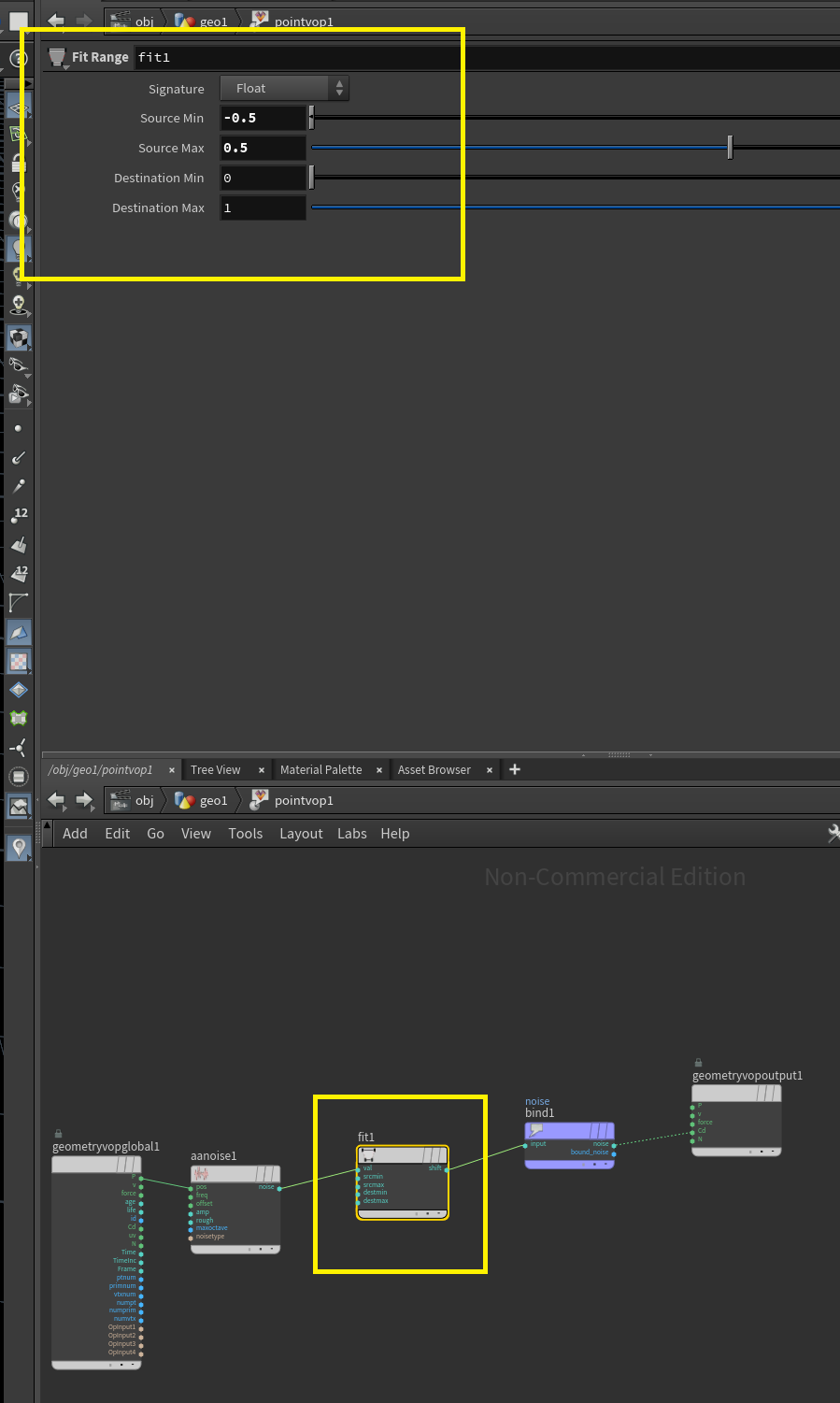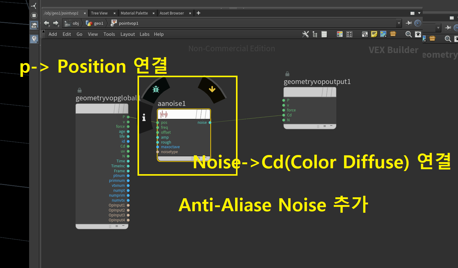 - Point VOP 노드를 추가하고, 'Position' 입력을 가져와 'Noise' 노드에 연결합니다.