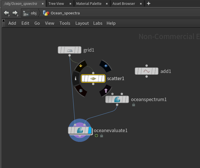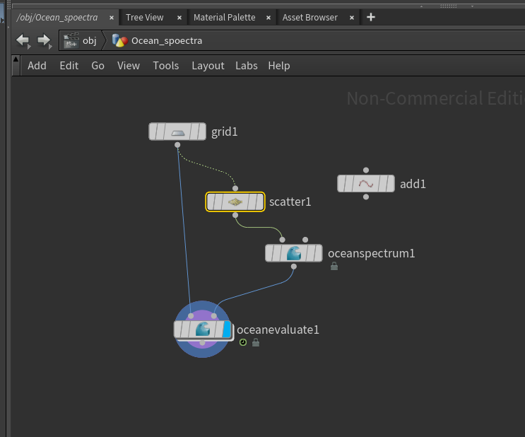 - Scatter 노드: Grid 노드로부터 생성된 지오메트리 위에 무작위 점들을 생성합니다. 이 점들은 Ocean Spectrum 노드로 전달되어 각각의 점에서 독립적인 파도가 생성되거나 다른 효과를 시뮬레이션하는 기반으로 사용됩니다.
