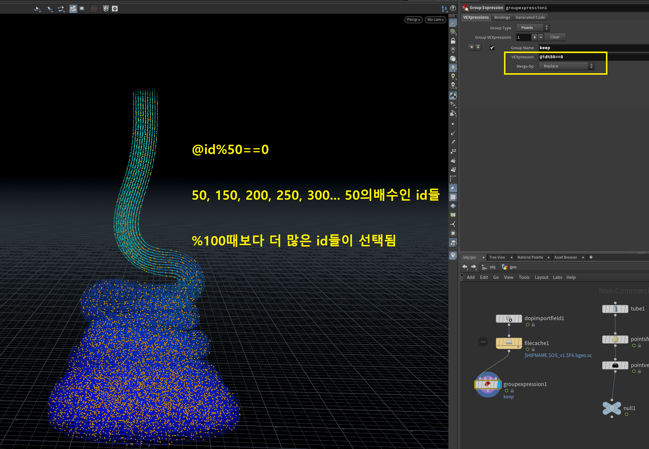 - Group Expression 노드의 VEXpression 필드에 @id%100==0를 입력합니다.