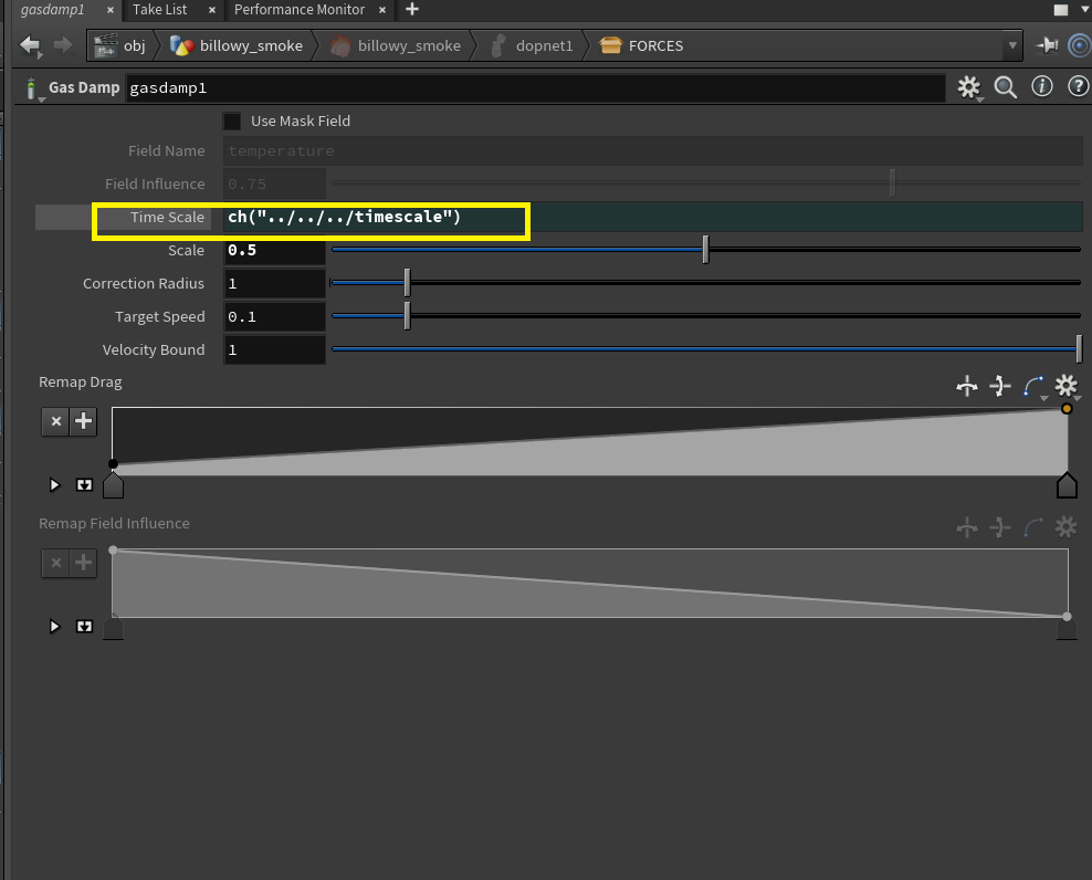 - 'gas damp'노드는 시뮬레이션의 특정 영역에서 에너지나 속도를 줄이는 역할을 한다.