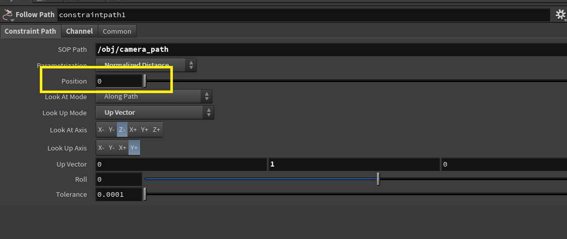 position을 0~1으로 옮기면 path를 따라 카메라가 이동한다 1프레임에 포지션0 넣고 키값주고, 마지막 프레임에 포지션 1 넣고 키값주면 됨~