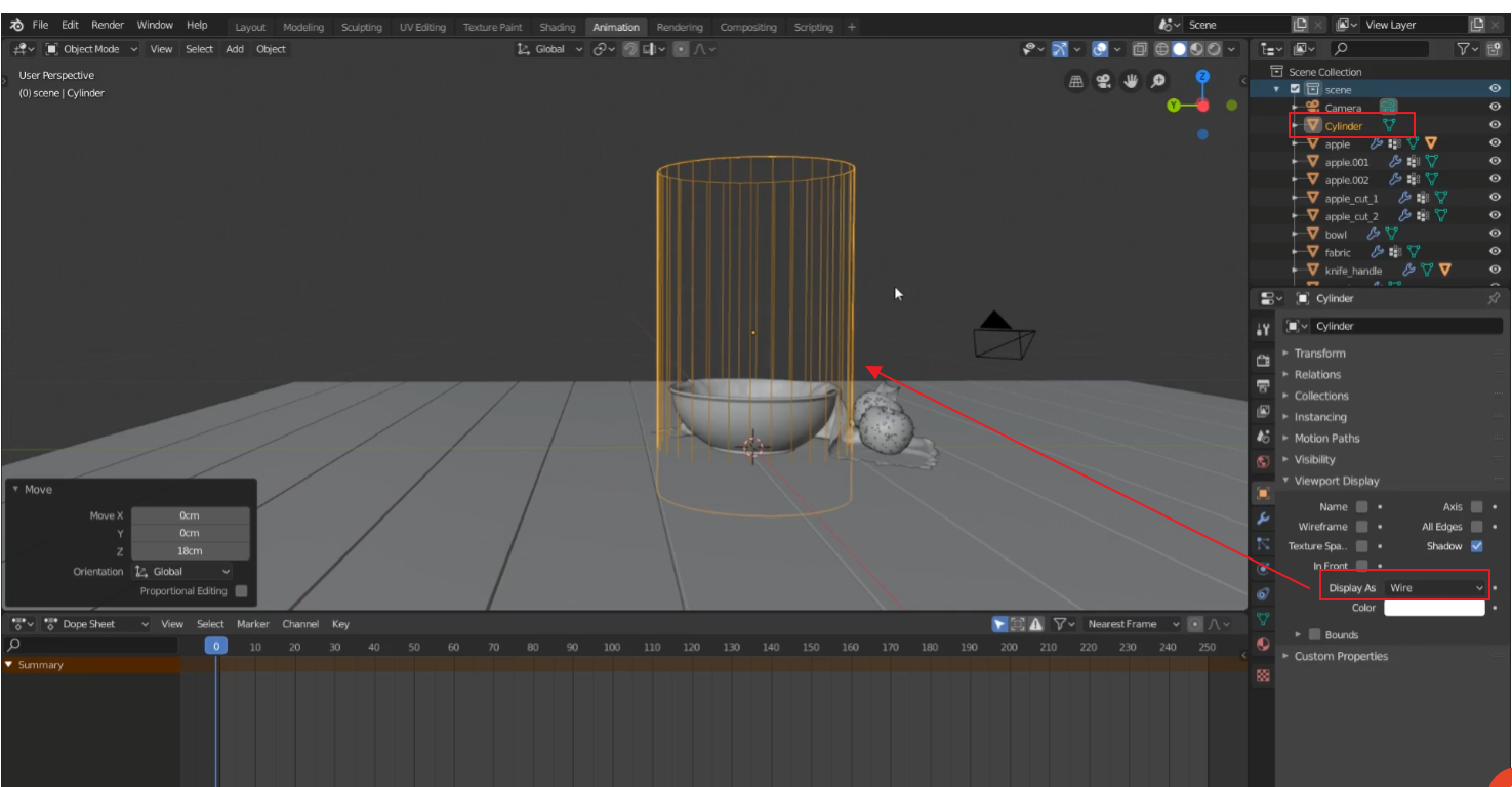 실린더를 만들어서 스케일 조정후 실린더 클릭-> Object properties -> Viewport Display에서 Display as를 Wire로 세팅해주면 저렇게 와이어처럼 변해야하는데 왜 나는 그냥 사라지는가...