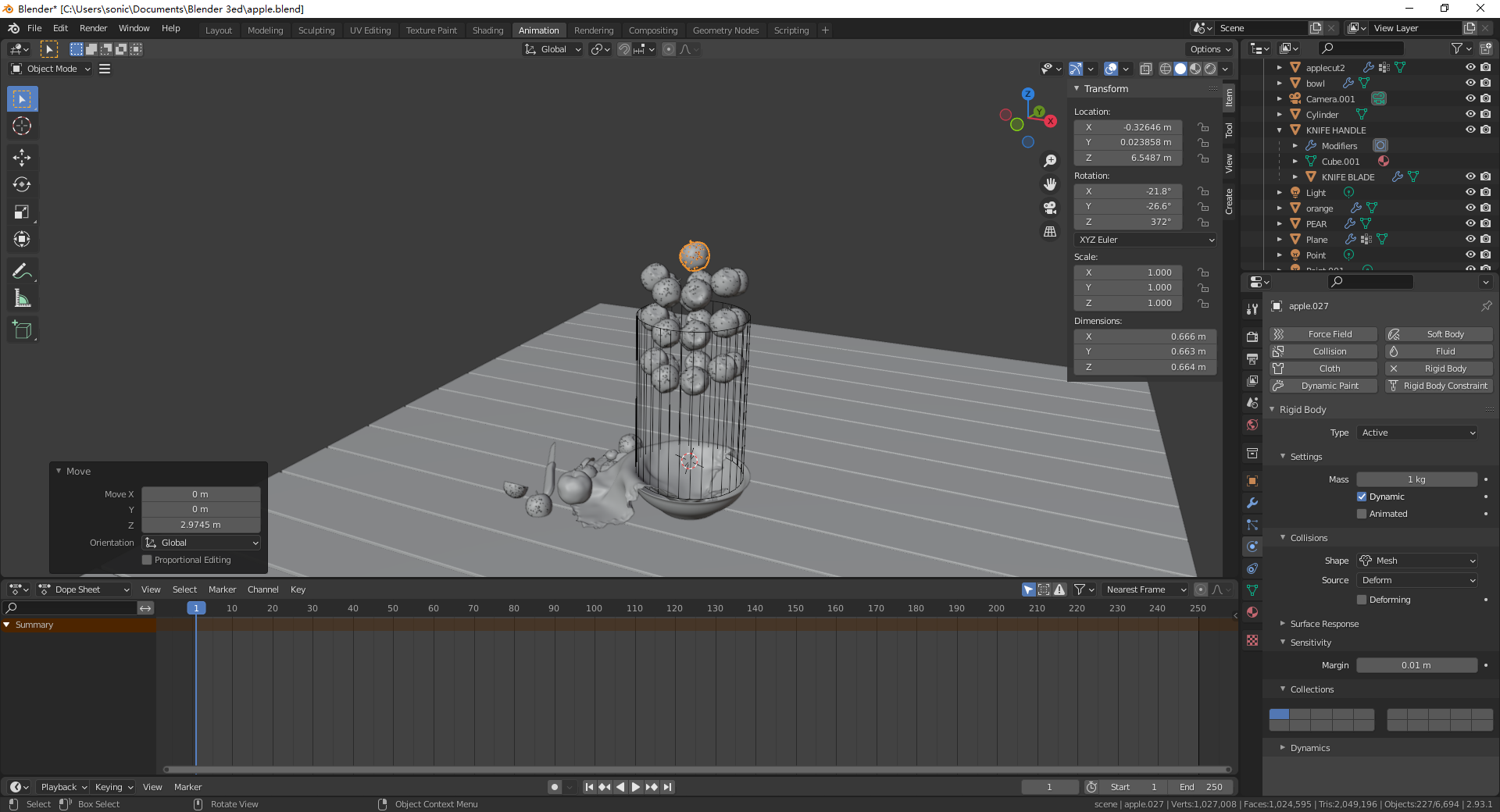 그리고 그 사과를 다시 여러개 Alt+D로 복사한 뒤 로테이션 변경해서 다양한 모양으로 떨어지게 해주기