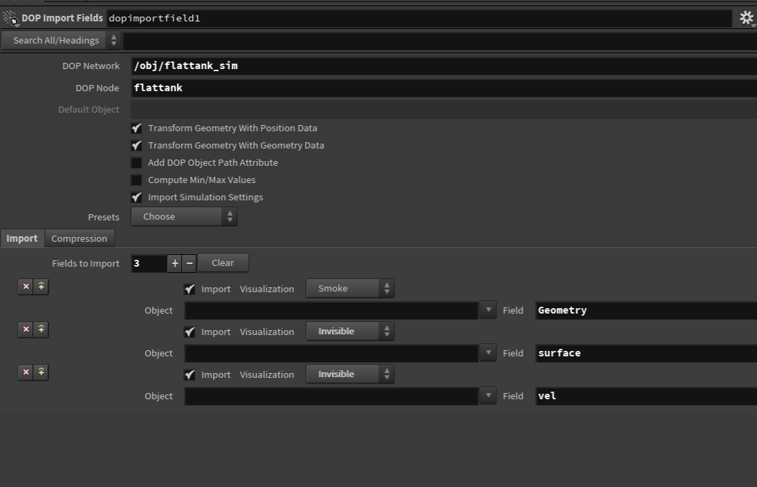 import_flattank (흰색 DOP Import Fields)이게 바로 surface / vel 필드를 가져오는 노드야.
