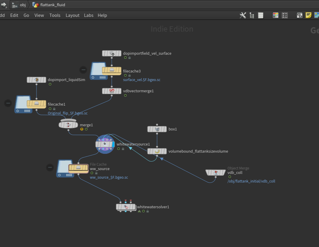 요렇게 dop import field (vdb:vel/surface) => vdb vector merge로 벡터형태 데이터들을 vel 로 만들어준다음 dop import로 들어오는 particle (fetch geometry 방식으로 import) 이랑 merge 해서 합쳐준것을 whitewater source에 넣어준다. 그러니깐 내가 너무 헷갈려서 다시 물어봤는데