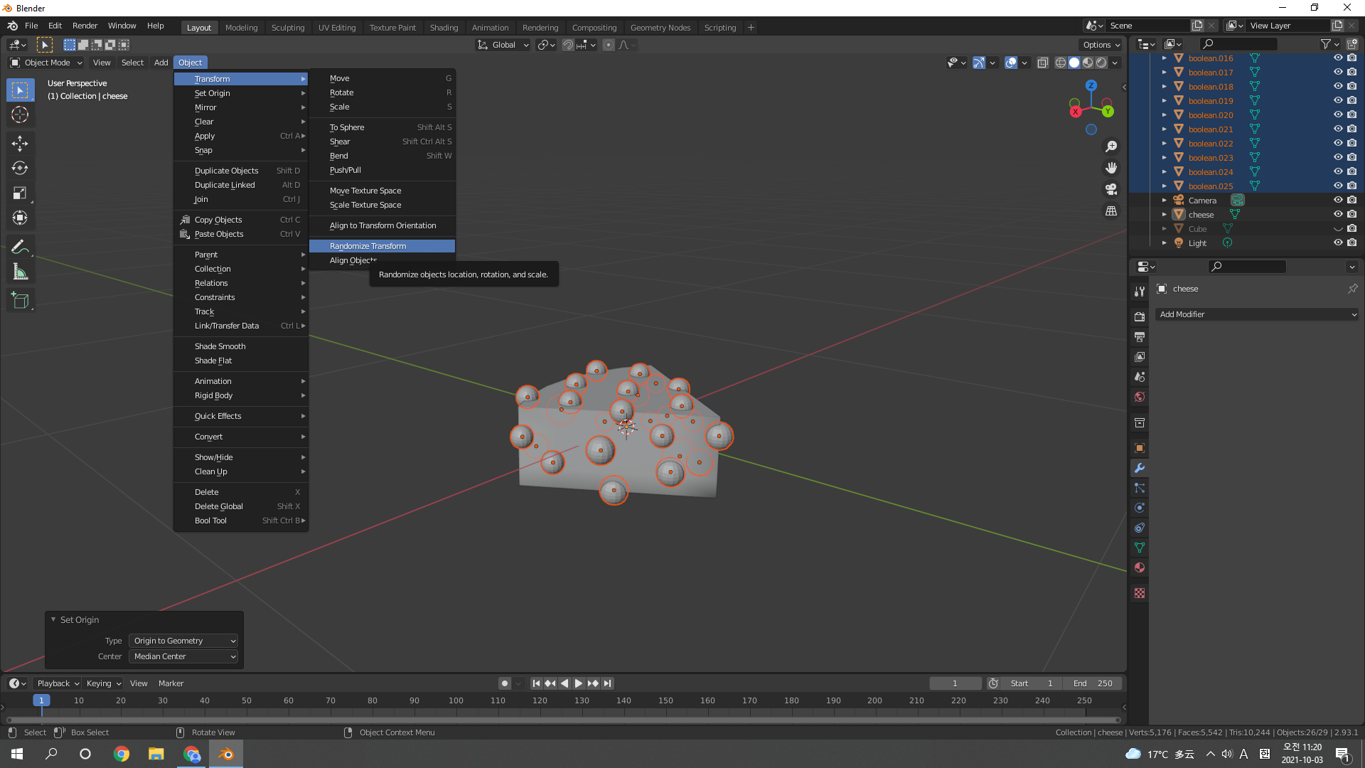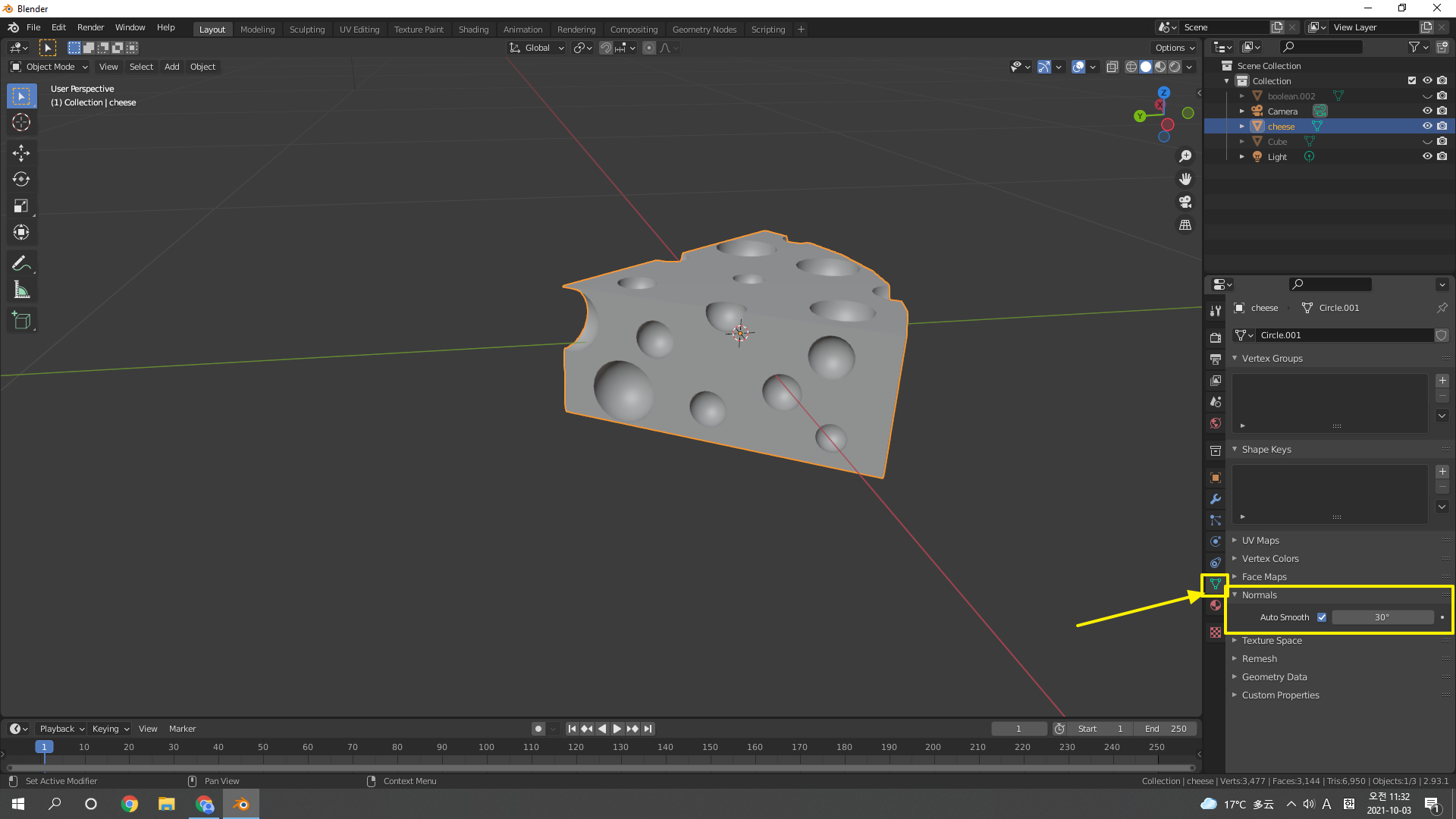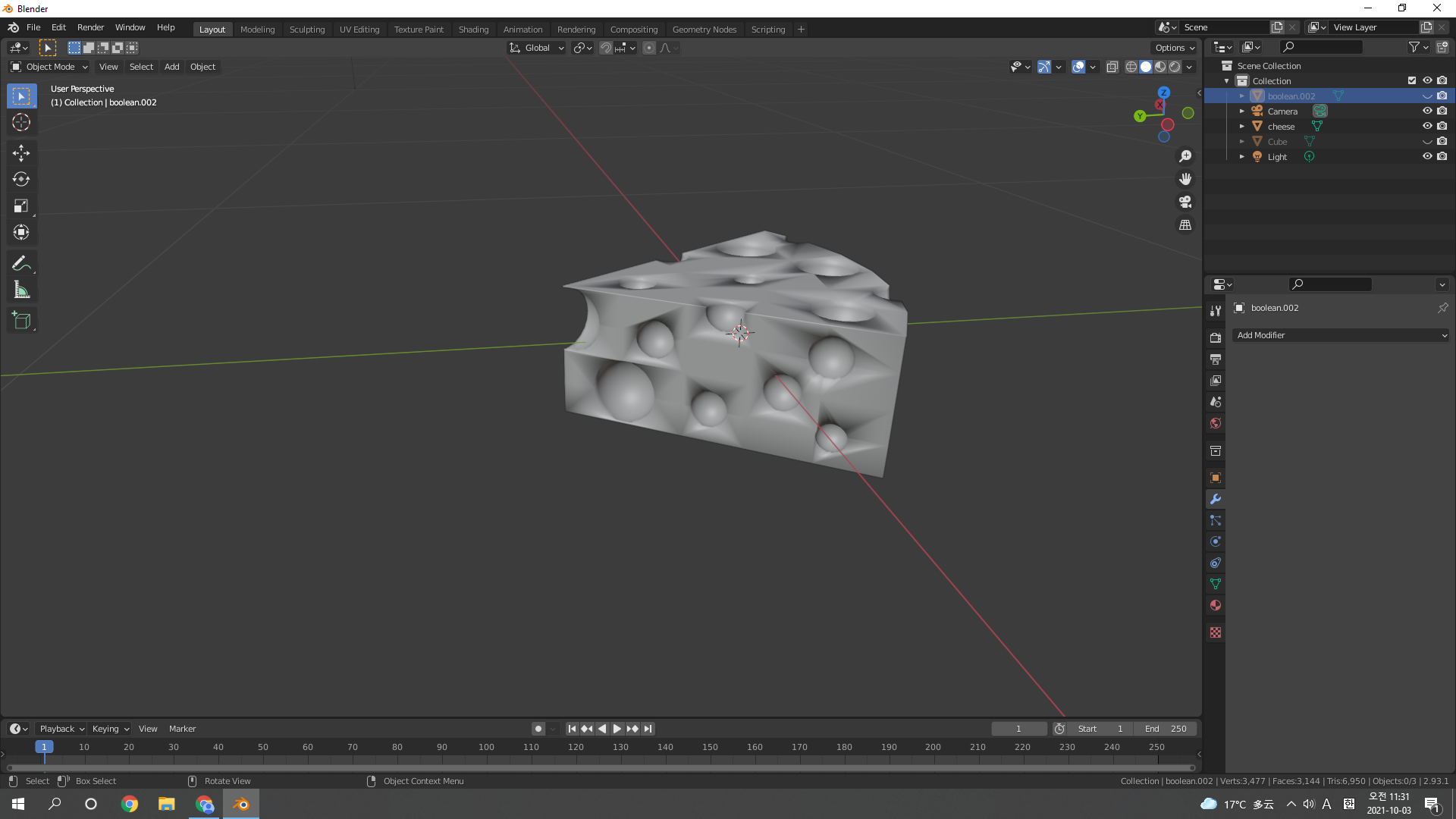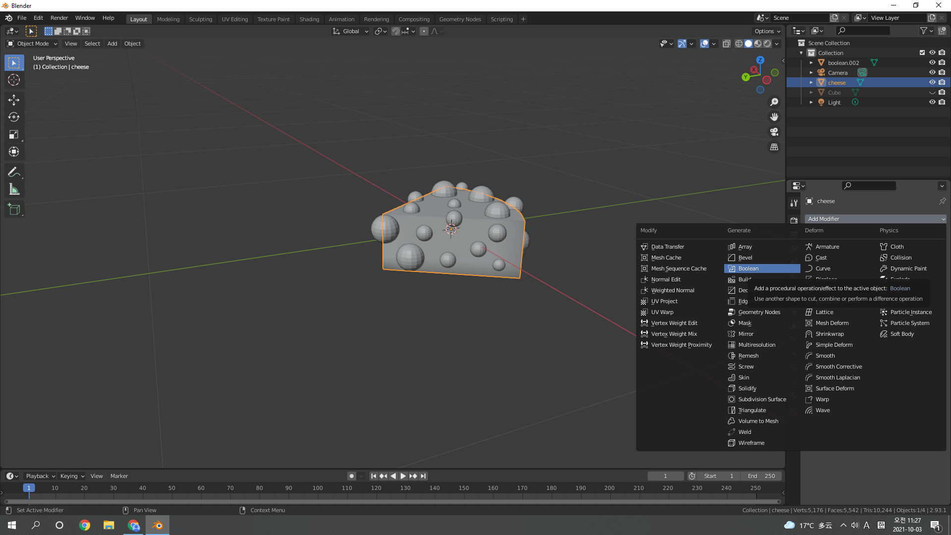 치즈 몸통 선택 후 Boolean modifier 추가추가추. 적용