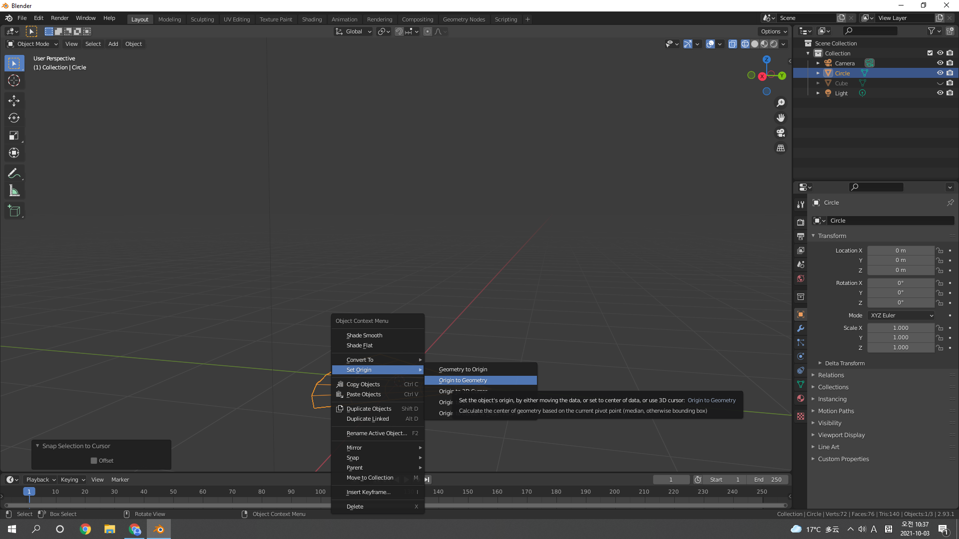 남은 조각 선택 후 Set Origins > Origin to Geometry이러면 Origin이 조각 가운데로 위치하게됨