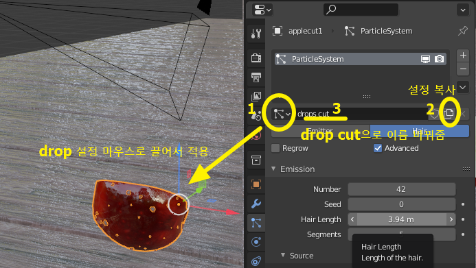 이제 반쪽짜리 사과에도 물방울 particle 시스템 적용시키자~~