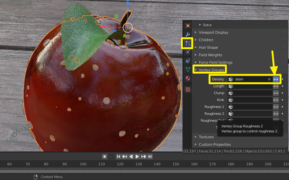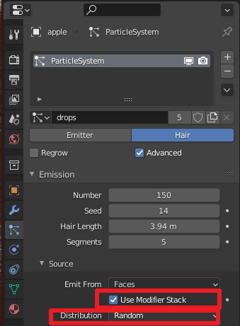 아까 Vertex Group한걸 이용해서 이번엔 사과 단면을 Particle 시스템에서 빼줄거임