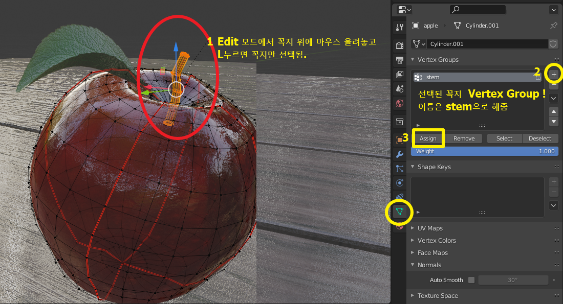 사과 단면 선택한다음 Vertex Group에서 그룹 추가해줌