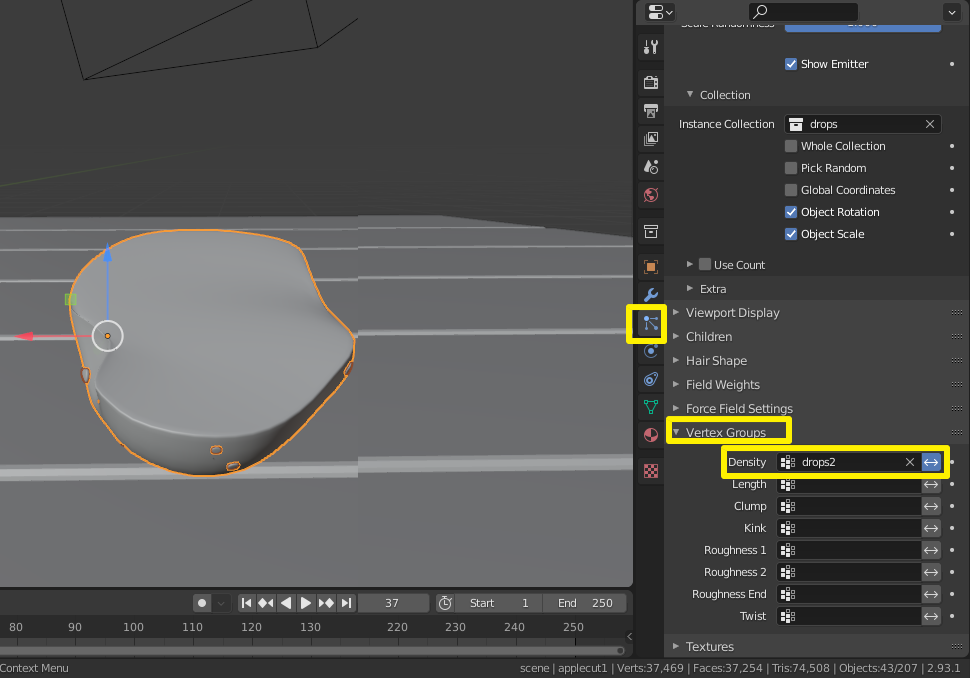 아까 Vertex Group한걸 이용해서 이번엔 사과 단면을 Particle 시스템에서 빼줄거임