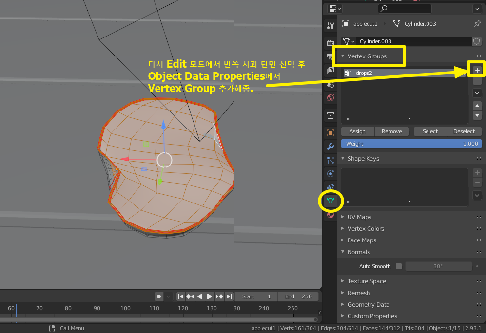 사과 단면 선택한다음 Vertex Group에서 그룹 추가해줌